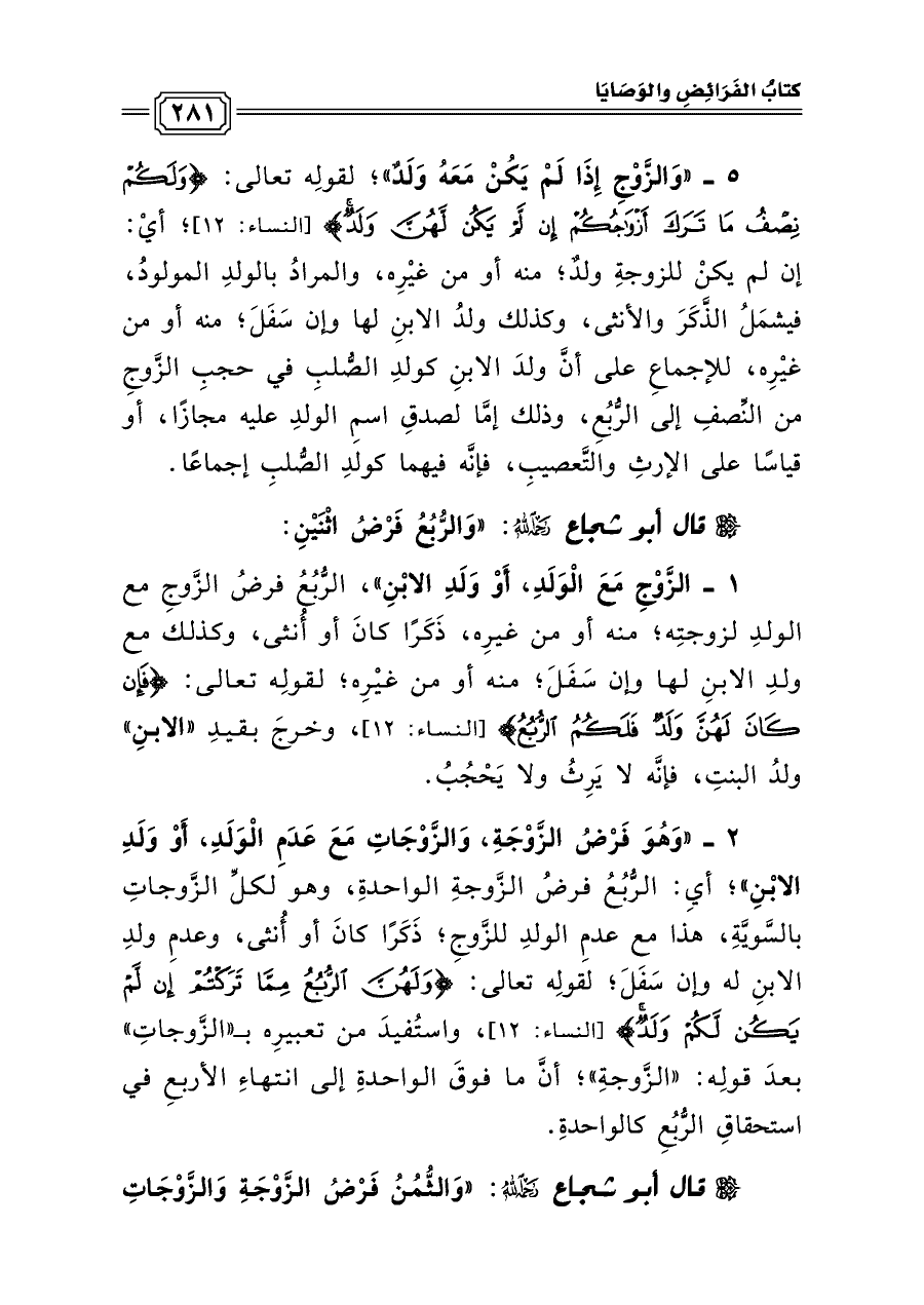 ٢ - «وَهُوَ فَرْضُ الزَّوْجَةِ، وَالزَّوْجَاتِ مَعَ عَدَمِ الْوَلَدِ، أَوْ وَلَدِ الابْنِ»؛ أيِ: الرُّبُعُ فرضُ الزَّوجةِ الواحدةِ، وهو لكلِّ الزَّوجاتِ بالسَّويَّةِ، هذا مع عدمِ الولدِ للزَّوجِ؛ ذَكَرًا كانَ أو أُنثى، وعدمِ ولدِ الابنِ له وإن سَفَلَ؛ لقولِه تعالى: {وَلَهُنَّ الرُّبُعُ مِمَّا تَرَكْتُمْ إِنْ لَمْ يَكُنْ لَكُمْ وَلَدٌ} [النساء: ١٢]، واستُفيدَ من تعبيرِه بـ «الزَّوجاتِ» بعدَ قولِه: «الزَّوجةِ»؛ أنَّ ما فوقَ الواحدةِ إلى انتهاءِ الأربعِ في استحقاقِ الرُّبُعِ كالواحدةِ.