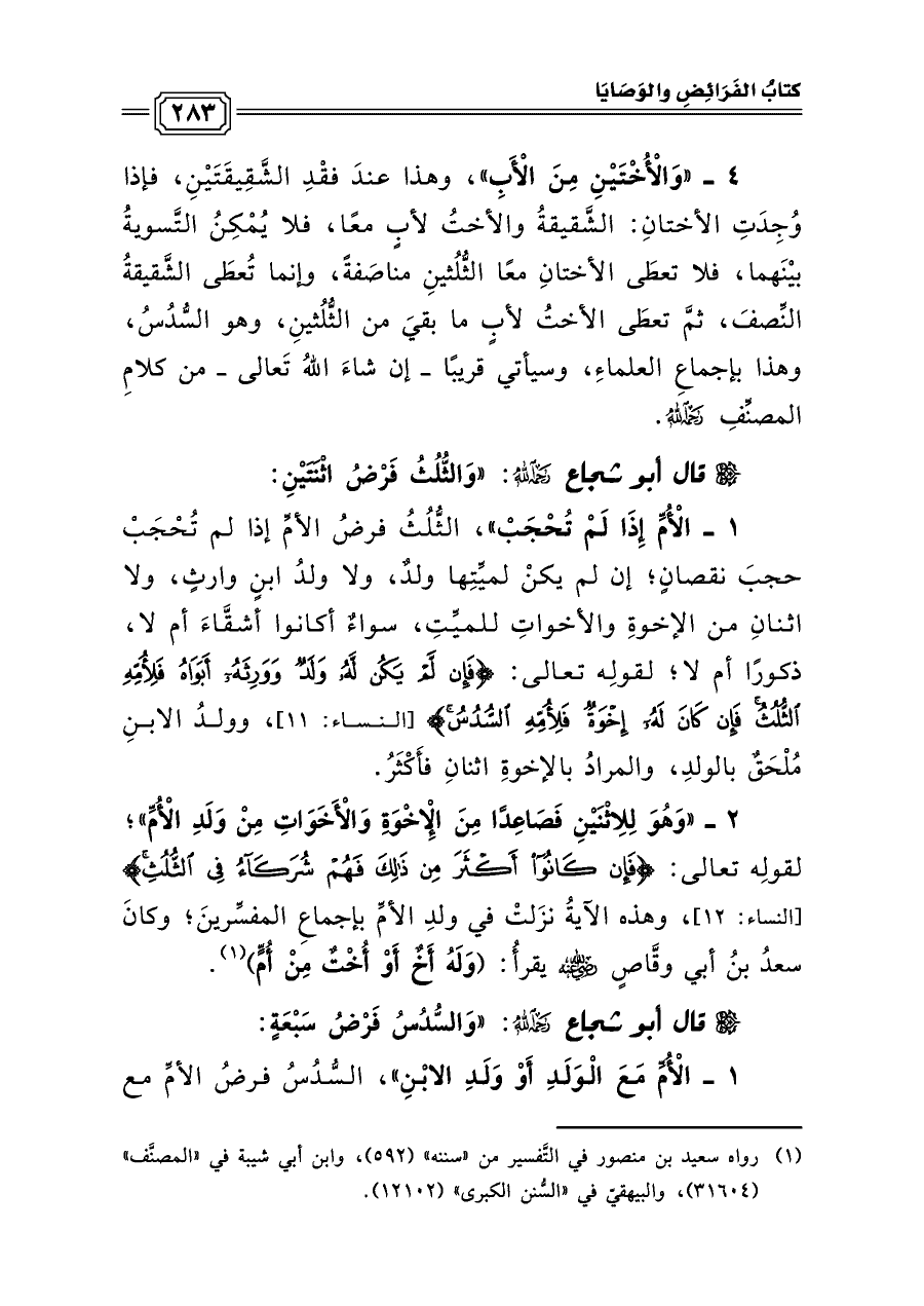 ٤ - «وَالْأُخْتَيْنِ مِنَ الْأَبِ»، وهذا عندَ فقْدِ الشَّقِيقَتَيْنِ، فإذا وُجِدَتِ الأختانِ: الشَّقيقةُ والأختُ لأبٍ معًا، فلا يُمْكِنُ التَّسويةُ بيْنَهما، فلا تعطَى الأختانِ معًا الثُّلُثينِ مناصَفةً، وإنما تُعطَى الشَّقيقةُ النِّصفَ، ثمَّ تعطَى الأختُ لأبٍ ما بقيَ من الثُّلُثينِ، وهو السُّدُسُ، وهذا بإجماعِ العلماءِ، وسيأتي قريبًا -إن شاءَ اللهُ تَعالى- من كلامِ المصنِّفِ رحمه الله.