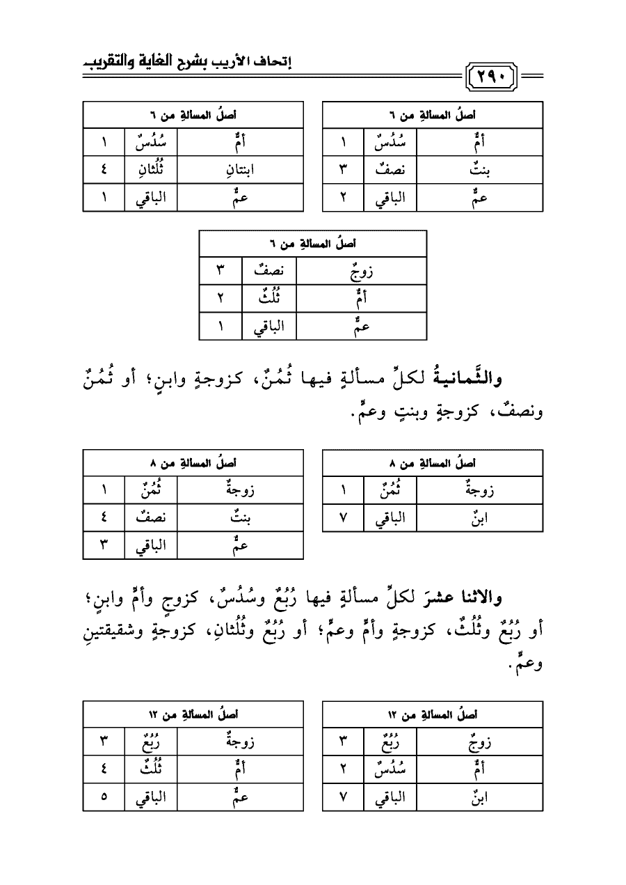 والاثنا عشرَ لكلِّ مسألةٍ فيها رُبُعٌ وسُدُسٌ، كزوجٍ وأمٍّ وابنٍ؛ أو رُبُعٌ وثُلُثٌ، كزوجةٍ وأمٍّ وعمٍّ؛ أو رُبُعٌ وثُلُثانِ، كزوجةٍ وشقيقتينِ وعمٍّ.