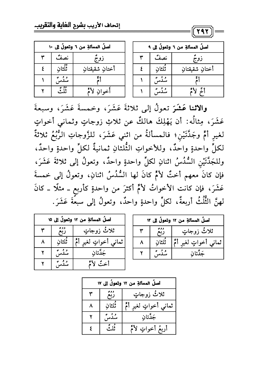 والاثنا عَشَرَ تعولُ إلى ثلاثةَ عَشَرَ، وخمسةَ عَشَرَ، وسبعةَ عَشَرَ، مِثالُه: أن يَهْلِكَ هالكٌ عن ثلاثِ زوجاتٍ وثماني أخواتٍ لغيرِ أمٍّ وجَدَّتَيْنِ، فالمسألةُ من اثني عَشَرَ، للزَّوجاتِ الرُّبُعُ ثلاثةٌ لكلِّ واحدةٍ واحدٌ، وللأخواتِ الثُّلثانِ ثمانيةٌ لكلِّ واحدةٍ واحدٌ، وللجَدَّتَيْنِ السُّدُسُ اثنانِ لكلِّ واحدةٍ واحدٌ، وتعولُ إلى ثلاثةَ عَشَرَ، فإن كانَ معهم أختٌ لأمٍّ كانَ لها السُّدُسُ اثنانِ، وتعولُ إلى خمسةَ عَشَرَ، فإن كانت الأخواتُ لأمٍّ أكثرَ من واحدةٍ كأربعٍ -مثلًا- كانَ لهنَّ الثُّلُثُ أربعةٌ، لكلِّ واحدةٍ واحدٌ، وتعولُ إلى سبعةَ عَشَرَ.