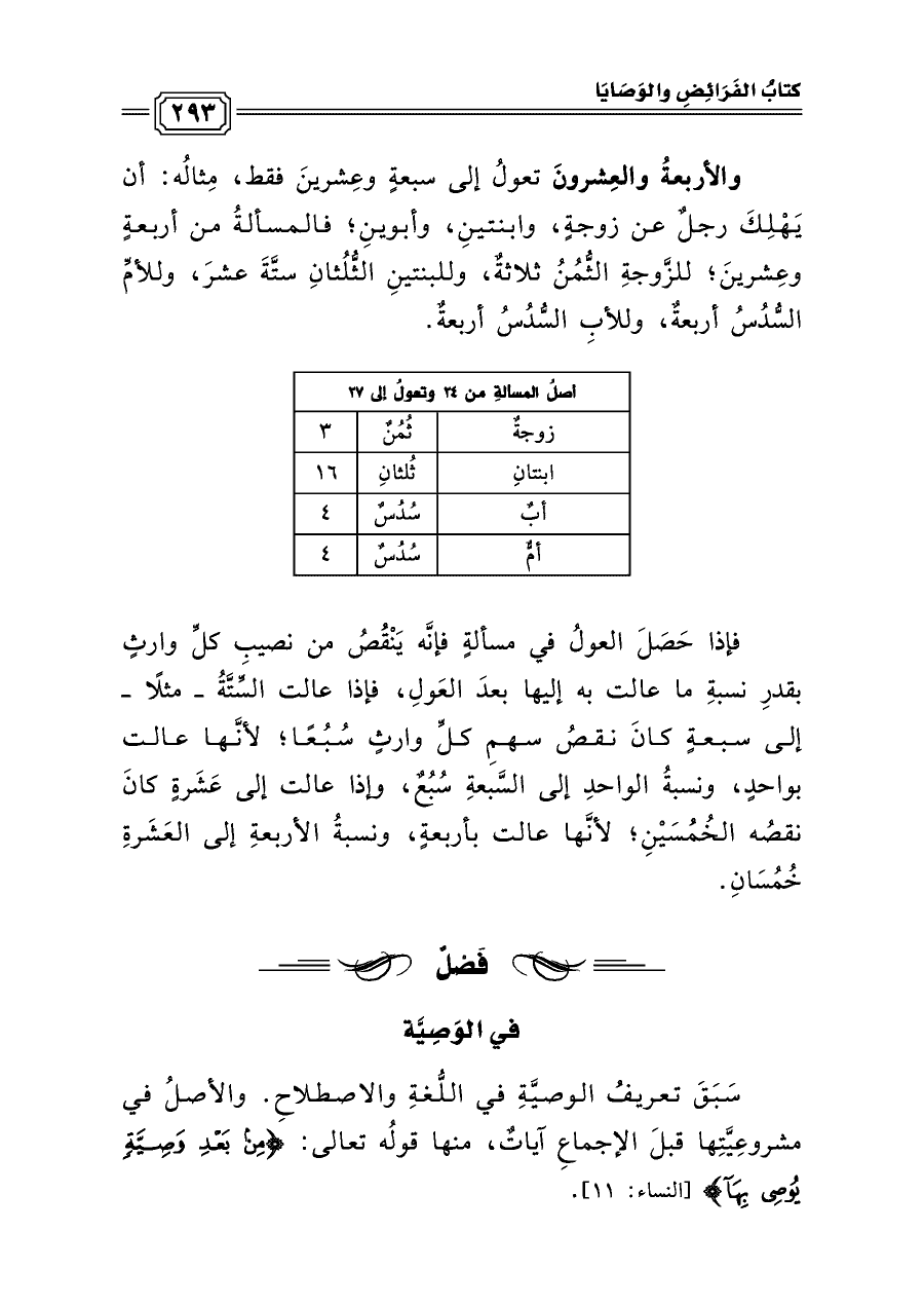 والأربعةُ والعِشرونَ تعولُ إلى سبعةٍ وعِشرينَ فقط، مِثالُه: أن يَهْلِكَ رجلٌ عن زوجةٍ، وابنتينِ، وأبوينِ، فالمسألةُ من أربعةٍ وعِشرينَ؛ للزَّوجةِ الثُّمُنُ ثلاثةٌ، وللبنتينِ الثُّلُثانِ ستَّةَ عشرَ، وللأمِّ السُّدُسُ أربعةٌ، وللأبِ السُّدُسُ أربعةٌ.