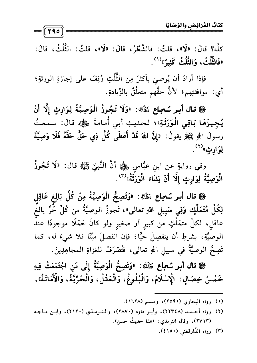 قال أبو شجاع رحمه الله: «وَلَا تَجُوزُ الْوَصِيَّةُ لِوَارِثٍ إِلَّا أَنْ يُجِيزَهَا بَاقِي الْوَرَثَةِ»؛ لحديثِ أبي أُمامةَ رضي الله عنه قالَ: سمعتُ رسولَ اللهِ صلى الله عليه وسلم يقولُ: «إِنَّ اللهَ قَدْ أَعْطَى كُلَّ ذِي حَقٍّ حَقَّهُ فَلَا وَصِيَّةَ لِوَارِثٍ» (¬٢).