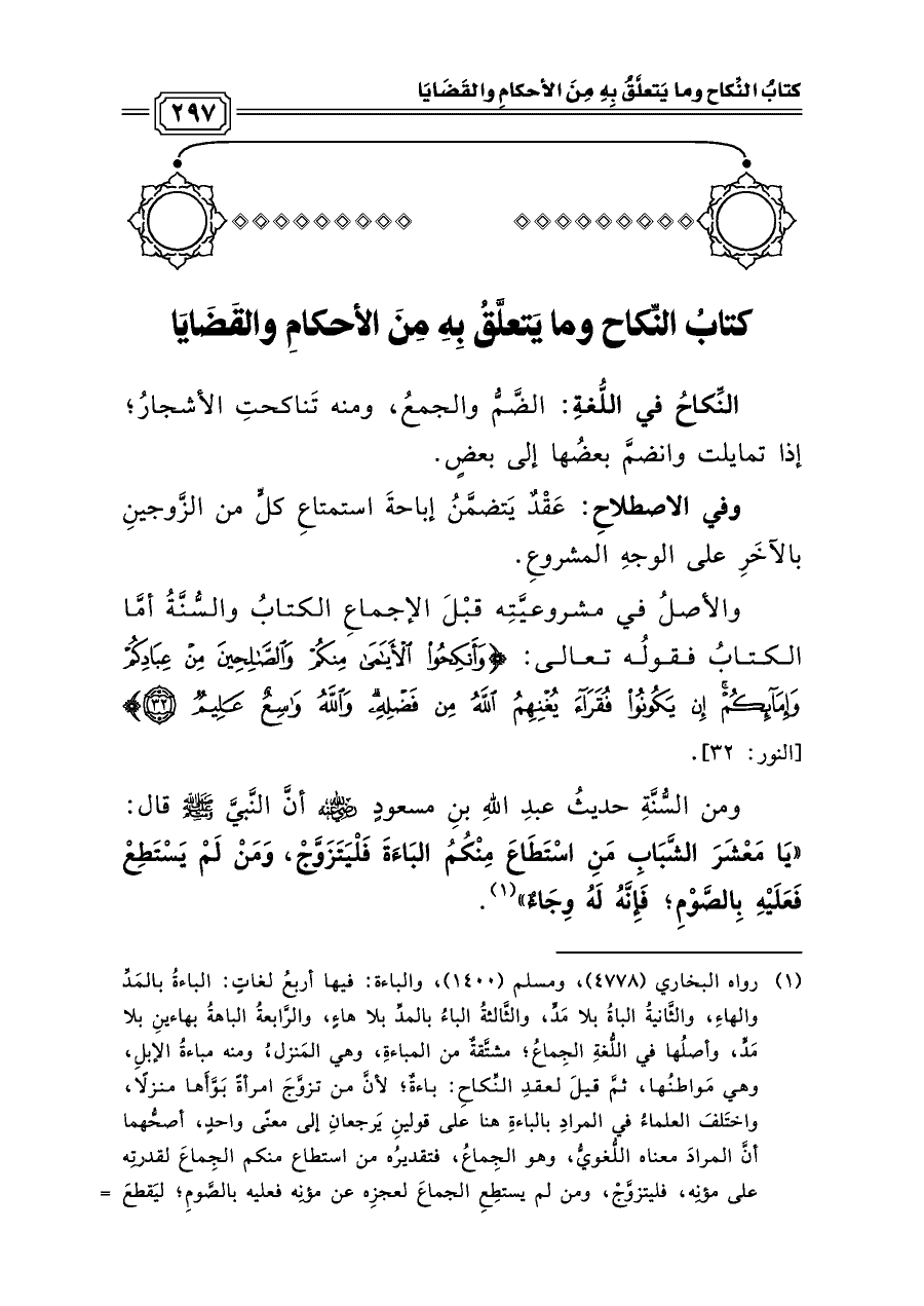 (¬١) رواه البخاري (٤٧٧٨)، ومسلم (١٤٠٠)، والباءة: فيها أربعُ لغاتٍ: الباءةُ بالمَدِّ والهاءِ، والثَّانيةُ الباةُ بلا مَدٍّ، والثَّالثةُ الباءُ بالمدِّ بلا هاءٍ، والرَّابعةُ الباهةُ بهاءينِ بلا مَدٍّ، وأصلُها في اللُّغةِ الجِماعُ؛ مشتَّقةٌ من المباءةِ، وهي المَنزل، ومنه مباءةُ الإبلِ، وهي مَواطنُها، ثمَّ قيلَ لعقدِ النِّكاحِ: باءةٌ؛ لأنَّ من تزوَّجَ امرأةً بَوَّأَها منزلًا، واختَلفَ العلماءُ في المرادِ بالباءةِ هنا على قولينِ يَرجعانِ إلى معنًى واحدٍ، أصحُّهما أنَّ المرادَ معناه اللُّغويُّ، وهو الجِماعُ، فتقديرُه من استطاع منكم الجِماعَ لقدرتِه على مؤنِه، فليتزوَّجْ، ومن لم يستطِعِ الجماعَ لعجزِه عن مؤنِه فعليه بالصَّومِ؛ ليَقطعَ شهوتَه، كما يقطعُها الوِجاءُ، والوِجاءُ: هو رَضُّ الخُصيتينِ، والمرادُ أنَّ الصَّومَ يَقطعُ الشَّهوةَ كما يَفعلُ الوِجاءُ.