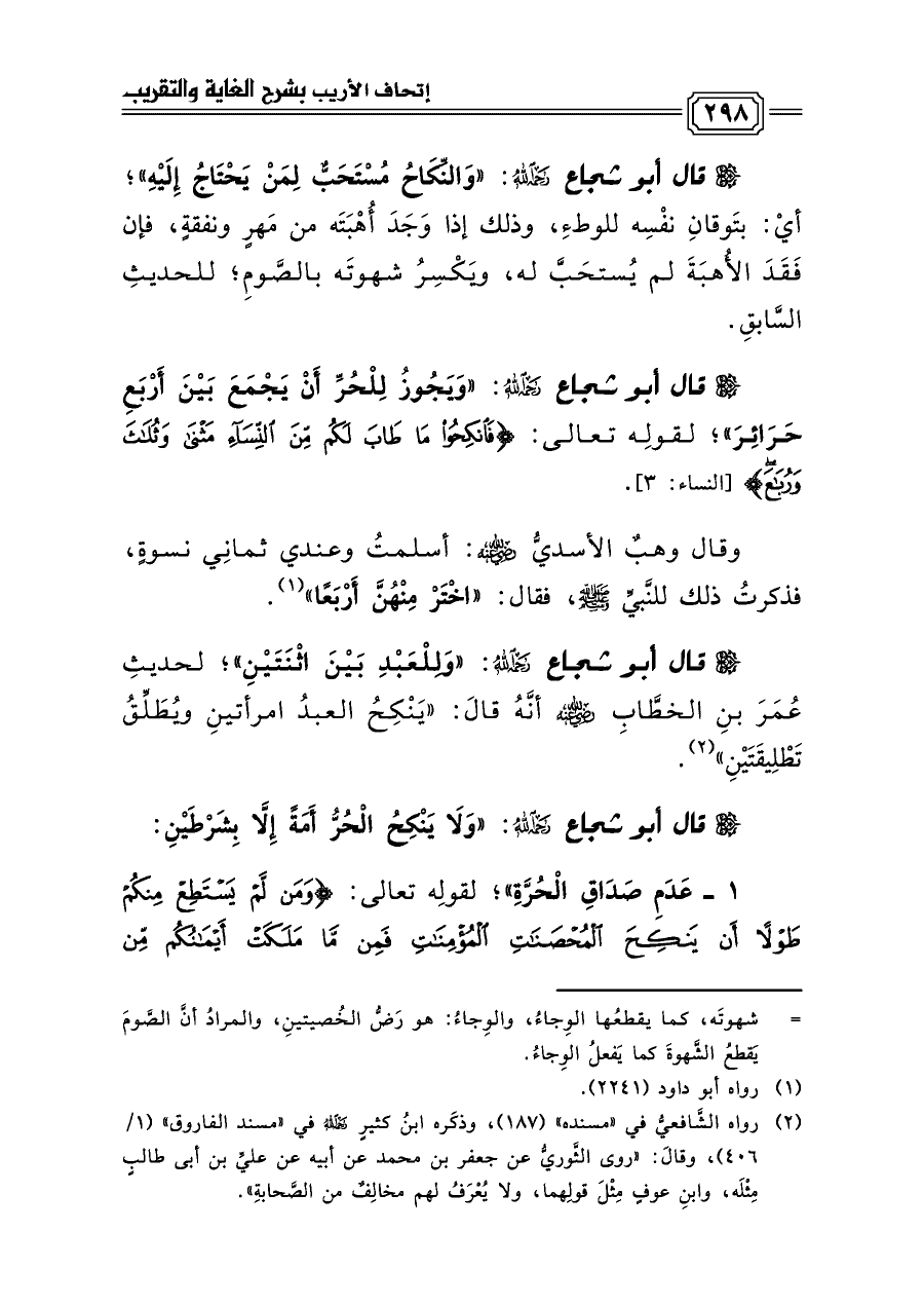 قال أبو شجاع رحمه الله: «وَلَا يَنْكِحُ الْحُرُّ أَمَةً إِلَّا بِشَرْطَيْنِ: