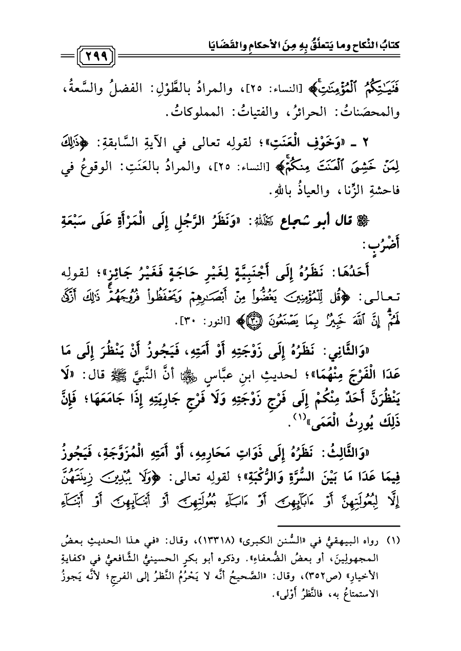 «وَالثَّانِي: نَظَرُهُ إِلَى زَوْجَتِهِ أَوْ أَمَتِهِ، فَيَجُوزُ أَنْ يَنْظُرَ إِلَى مَا عَدَا الْفَرْجَ مِنْهُمَا»؛ لحديثِ ابنِ عبَّاسٍ رضي الله عنهما أنَّ النَّبيَّ صلى الله عليه وسلم قالَ: «لَا يَنْظُرَنَّ أَحَدٌ مِنْكُمْ إِلَى فَرْجِ زَوْجَتِهِ وَلَا فَرْجِ جَارِيَتِهِ إِذَا جَامَعَهَا؛ فَإِنَّ ذَلِكَ يُورِثُ الْعَمَى» (¬١).