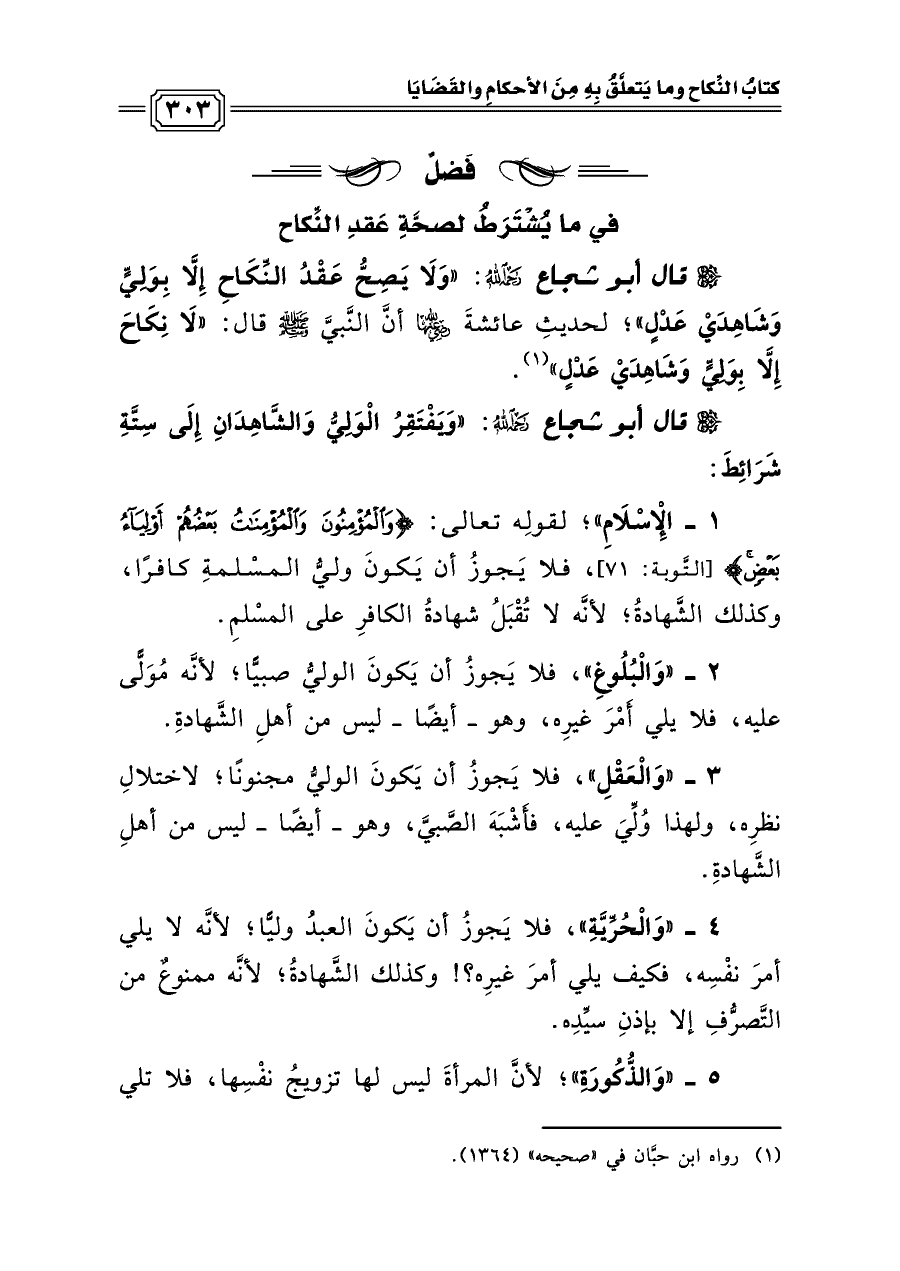 قال أبو شجاع رحمه الله: «وَيَفْتَقِرُ الْوَلِيُّ وَالشَّاهِدَانِ إِلَى سِتَّةِ شَرَائِطَ: