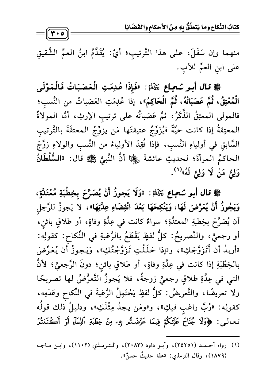 قال أبو شجاع رحمه الله: «وَلَا يَجوزُ أَنْ يُصَرِّحَ بِخِطْبَةِ مُعْتَدَّةٍ، وَيَجُوزُ أَنْ يُعَرِّضَ لَهَا، وَيَنْكِحَهَا بَعْدَ انْقِضَاءِ عِدَّتِهَا»، لا يَجوزُ للرَّجلِ أن يُصَرِّحَ بخِطبةِ المعتدَّةِ؛ سواءٌ كانت في عِدَّةِ وفاةٍ، أو طلاقٍ بائنٍ، أو رجعيٍّ، والتَّصريحُ: كلُّ لفظٍ يَقْطَعُ بالرَّغبةِ في النِّكاحِ: كقولِه: «أريدُ أن أَتَزَوَّجَكِ»، و «إذا حَلَلْتِ تَزَوَّجْتُكِ»، وَيَجوزُ أن يُعَرِّضَ بالخِطْبَةِ إذا كانت في عِدَّةِ وفاةٍ، أو طلاقٍ بائنٍ؛ دونَ الرَّجعيِّ؛ لأنَّ التي في عِدَّةِ طلاقٍ رجعيٍّ زوجةٌ، فلا يَجوزُ التَّعرُّضُ لها تصريحًا ولا تعريضًا، والتَّعريضُ: كلُّ لفظٍ يَحْتَمِلُ الرَّغبةَ في النِّكاحِ وعَدَمِه، كقولِه: «رُبَّ راغبٍ فيكِ»، و «ومَن يجدُ مِثْلَكِ»، ودليلُ ذلك قولُه تعالى: {وَلَا جُنَاحَ عَلَيْكُمْ فِيمَا عَرَّضْتُمْ بِهِ مِنْ خِطْبَةِ النِّسَاء أَوْ أَكْنَنتُمْ