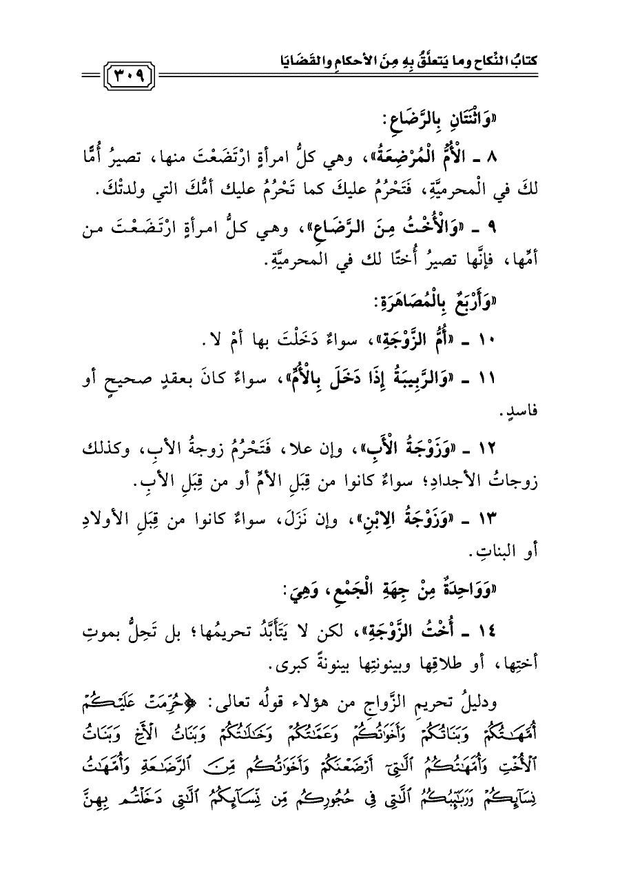 ١٤ - أُخْتُ الزَّوْجَةِ»، لكن لا يَتَأَبَّدُ تحريمُها؛ بل تَحِلُّ بموتِ أختِها، أو طلاقِها وبينونتِها بينونةً كبرى.