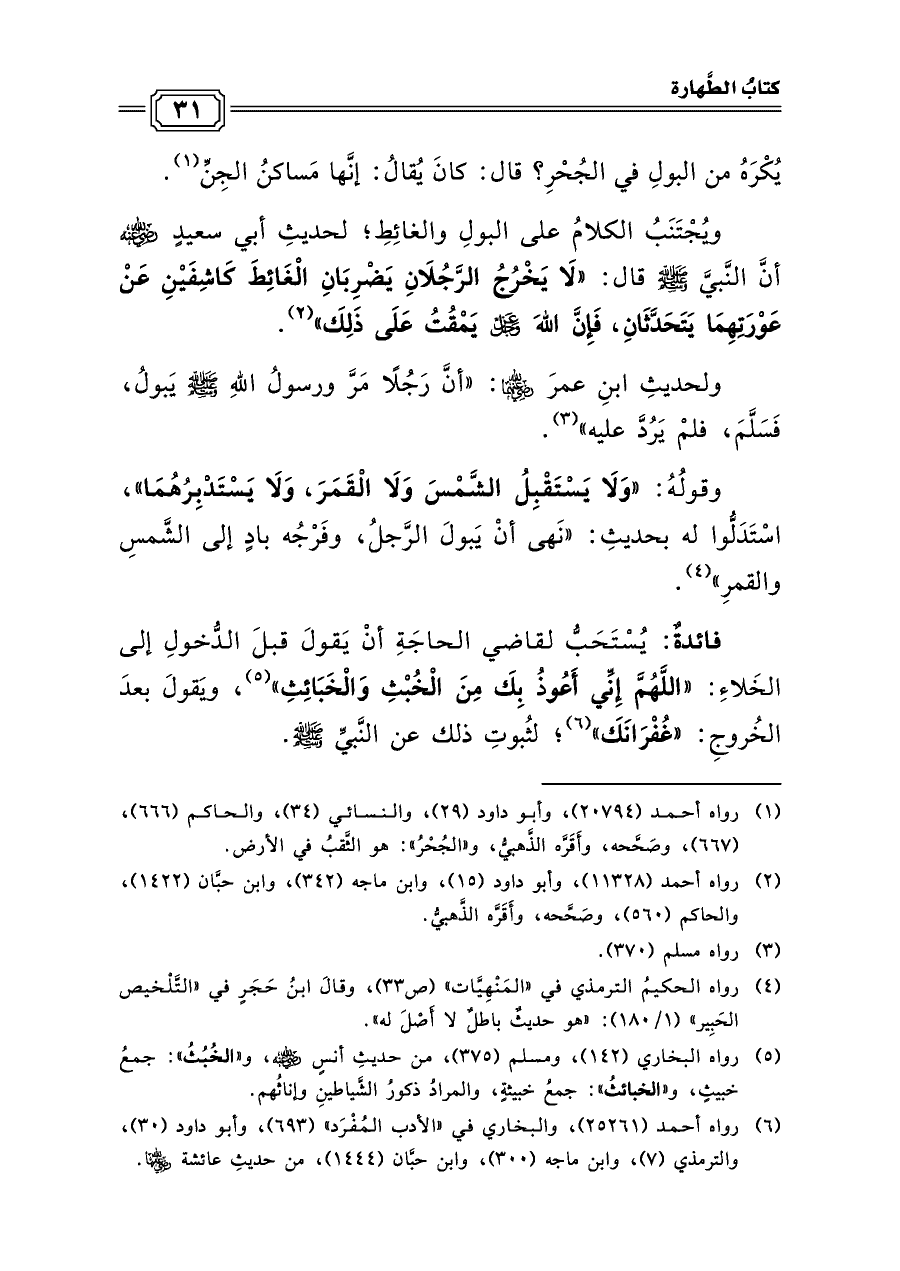 ولحديثِ ابنِ عمرَ رضي الله عنهما: «أنَّ رَجُلًا مَرَّ ورسولُ اللهِ صلى الله عليه وسلم يَبولُ، فَسَلَّمَ، فلمْ يَرُدَّ عليه» (¬٣).