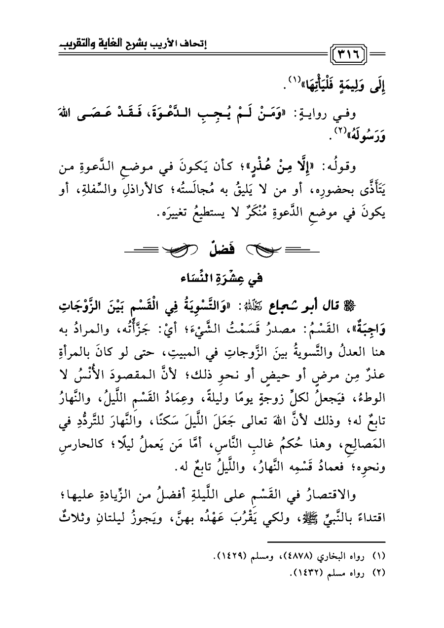 قال أبو شجاع رحمه الله: «وَالتَّسْوِيَةُ فِي الْقَسْمِ بَيْنَ الزَّوْجَاتِ وَاجِبَةٌ»، القَسْمُ: مصدرُ قَسَمْتُ الشَّيْءَ؛ أيْ: جَزَّأْتُه، والمرادُ به هنا العدلُ والتَّسويةُ بينَ الزَّوجاتِ في المبيتِ، حتى لو كانَ بالمرأةِ عذرٌ مِن مرضٍ أو حيضٍ أو نحوِ ذلك؛ لأنَّ المقصودَ الأُنْسُ لا الوطءُ، فيَجعلُ لكلِّ زوجةٍ يومًا وليلةً، وعِمَادُ القَسْمِ اللَّيلُ، والنَّهارُ تابعٌ له؛ وذلك لأنَّ اللهَ تعالى جَعَلَ اللَّيلَ سَكنًا، والنَّهارَ للتَّردُّدِ في المَصالِحِ، وهذا حُكمُ غالبِ النَّاسِ، أمَّا مَن يَعملُ ليلًا، كالحارسِ ونحوِه؛ فعمادُ قَسْمِه النَّهارُ، واللَّيلُ تابعٌ له.