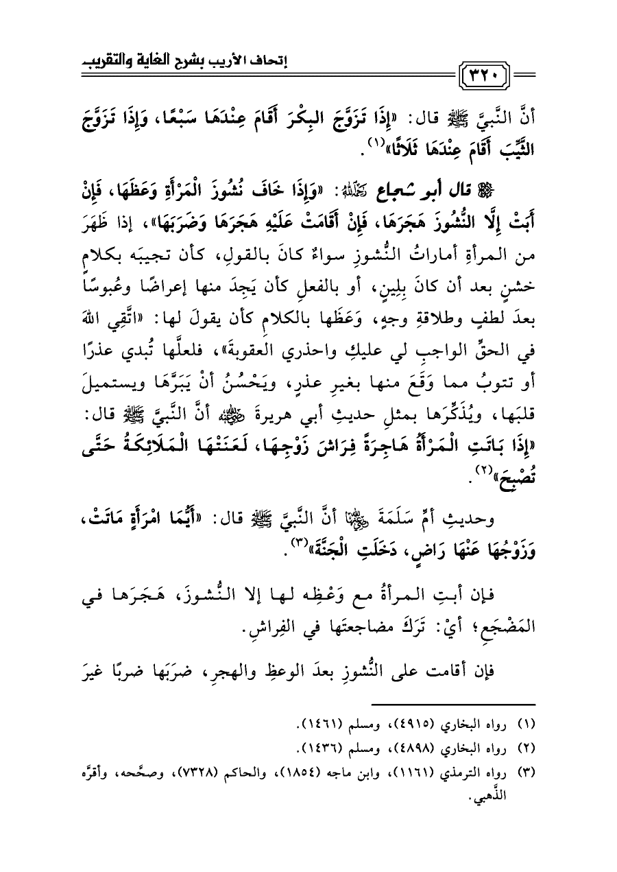 قال أبو شجاع رحمه الله: «وَإِذَا خَافَ نُشُوزَ الْمَرْأَةِ وَعَظَهَا، فَإِنْ أَبَتْ إِلَّا النُّشُوزَ هَجَرَهَا، فَإِنْ أَقَامَتْ عَلَيْهِ هَجَرَهَا وَضَرَبَهَا»، إذا ظَهَرَ من المرأةِ أماراتُ النُّشوزِ سواءٌ كانَ بالقولِ، كأن تجيبَه بكلامٍ خشنٍ بعد أن كانَ بِلِينٍ، أو بالفعلِ كأن يَجِدَ منها إعراضًا وعُبوسًا بعدَ لطفٍ وطلاقةِ وجهٍ، وَعَظَها بالكلامِ كأن يقولَ لها: «اتَّقِي اللهَ في الحقِّ الواجبِ لي عليكِ واحذري العقوبةَ»، فلعلَّها تُبدي عذرًا أو تتوبُ مما وَقَعَ منها بغيرِ عذرٍ، ويَحْسُنُ أنْ يَبَرَّهَا ويستميلَ قلبَها، ويُذَكِّرَها بمثلِ حديثِ أبي هريرةَ رضي الله عنه أنَّ النَّبيَّ صلى الله عليه وسلم قالَ: «إِذَا بَاتَتِ الْمَرْأَةُ هَاجِرَةً فِرَاشَ زَوْجِهَا، لَعَنَتْهَا الْمَلَائِكَةُ حَتَّى تُصْبِحَ» (¬٢).
