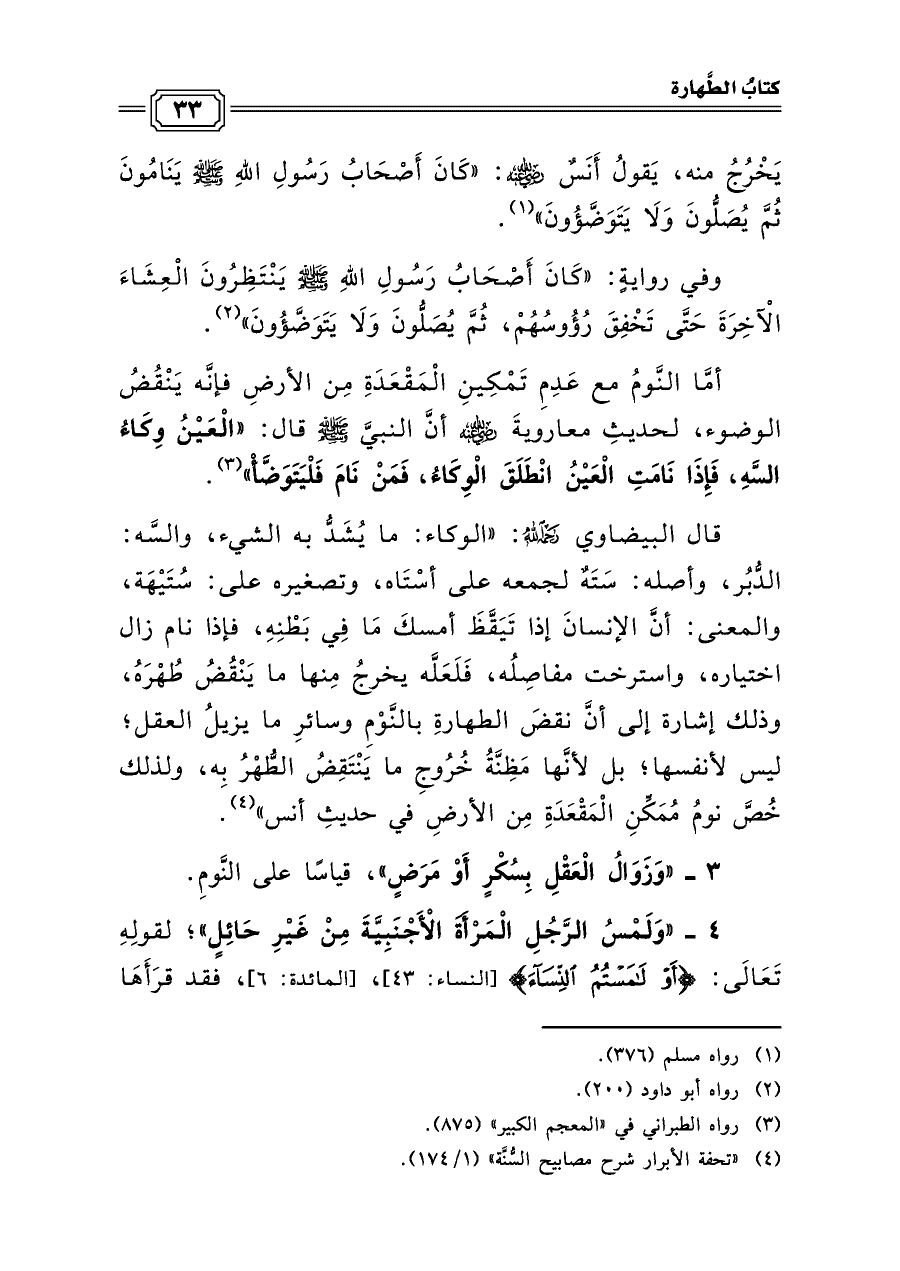 يَخْرُجُ منه، يَقولُ أَنَسٌ رضي الله عنه: «كَانَ أَصْحَابُ رَسُولِ اللهِ صلى الله عليه وسلم يَنَامُونَ ثُمَّ يُصَلُّونَ وَلَا يَتَوَضَّئُونَ» (¬١).