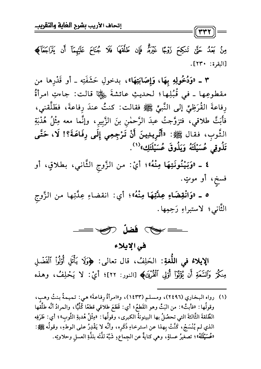 ٣ - «وَدُخُولِهِ بِهَا، وَإِصَابَتِهَا»، بدخولِ حَشَفَتِه -أو قَدْرِها من مقطوعِها- في قُبُلِها؛ لحديثِ عائشةَ رضي الله عنها قالت: جاءتِ امرأةُ رِفاعةَ القُرَظِيِّ إلى النَّبيِّ صلى الله عليه وسلم فقالت: كنتُ عندَ رِفاعةَ، فطَلَّقني، فأَبَتَّ طلاقي، فتزوَّجتُ عبدَ الرَّحمنِ بنَ الزَّبِيرِ، وإنَّما معه مِثْلُ هُدْبَةِ الثَّوبِ، فقال صلى الله عليه وسلم: «أَتُرِيدِينَ أَنْ تَرْجِعِي إِلَى رِفَاعَةَ؟! لَا، حَتَّى تَذُوقِي عُسَيْلَتَهُ وَيَذُوقَ عُسَيْلَتَكِ» (¬١).
