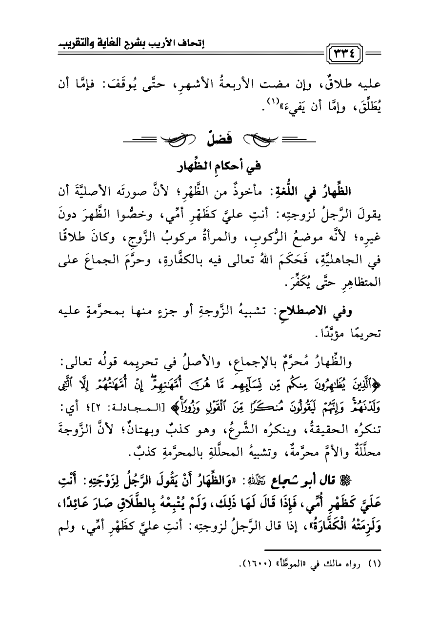 قال أبو شجاع رحمه الله: «وَالظِّهَارُ أَنْ يَقُولَ الرَّجُلُ لِزَوْجَتِهِ: أَنْتِ عَلَيَّ كَظَهْرِ أُمِّي، فَإِذَا قَالَ لَهَا ذَلِكَ، وَلَمْ يُتْبِعْهُ بِالطَّلَاقِ صَارَ عَائِدًا، وَلَزِمَتْهُ الْكَفَّارَةُ»، إذا قال الرَّجلُ لزوجتِه: أنتِ عليَّ كظَهْرِ أمِّي، ولم