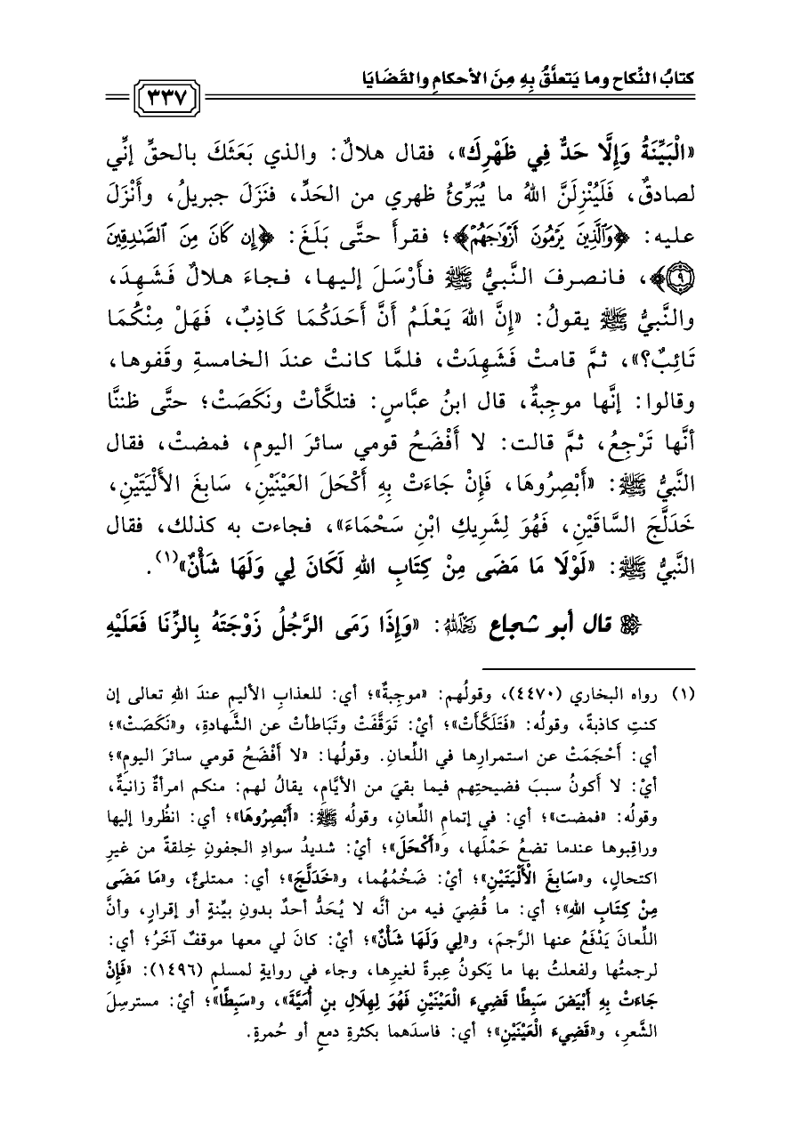 «الْبَيِّنَةُ وَإِلَّا حَدٌّ فِي ظَهْرِكَ»، فقال هلالٌ: والذي بَعَثَكَ بالحقِّ إنِّي لصادقٌ، فَلَيُنْزِلَنَّ اللهُ ما يُبَرِّئُ ظهري من الحَدِّ، فنَزَلَ جبريلُ، وأَنْزَلَ عليه: {وَالَّذِينَ يَرْمُونَ أَزْوَاجَهُمْ ... }؛ فقرأَ حتَّى بَلَغَ: {إِنْ كَانَ مِنَ الصَّادِقِينَ}، فانصرفَ النَّبيُّ صلى الله عليه وسلم فأَرْسَلَ إليها، فجاءَ هلالٌ فَشَهِدَ، والنَّبيُّ صلى الله عليه وسلم يقولُ: «إِنَّ اللهَ يَعْلَمُ أَنَّ أَحَدَكُمَا كَاذِبٌ، فَهَلْ مِنْكُمَا تَائِبٌ؟»، ثمَّ قامتْ فَشَهِدَتْ، فلمَّا كانتْ عندَ الخامسةِ وقَفوها، وقالوا: إنَّها موجِبةٌ، قال ابنُ عبَّاسٍ: فتلكَّأتْ ونَكَصَتْ؛ حتَّى ظننَّا أنَّها تَرْجِعُ، ثمَّ قالت: لا أَفْضَحُ قومي سائرَ اليومِ، فمضتْ، فقال النَّبيُّ صلى الله عليه وسلم: «أَبْصِرُوهَا، فَإِنْ جَاءَتْ بِهِ أَكْحَلَ العَيْنَيْنِ، سَابِغَ الأَلْيَتَيْنِ، خَدَلَّجَ السَّاقَيْنِ، فَهُوَ لِشَرِيكِ ابْنِ سَحْمَاءَ»، فجاءت به كذلك، فقال النَّبيُّ صلى الله عليه وسلم: «لَوْلَا مَا مَضَى مِنْ كِتَابِ اللهِ لَكَانَ لِي وَلَهَا شَأْنٌ» (¬١).