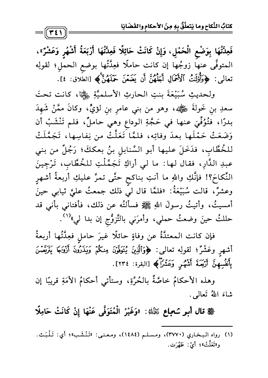 ولحديثِ سُبَيْعَةَ بنتِ الحارثِ الأسلميَّةِ رضي الله عنها، كانت تحتَ سعدِ بنِ خَولةَ رضي الله عنه، وهو من بني عامرِ بنِ لؤيٍّ، وكانَ ممَّنْ شَهِدَ بدرًا، فتُوُفِّيَ عنها في حَجَّةِ الوداعِ وهي حاملٌ، فلم تَنْشَبْ أن وَضَعَتْ حَمْلَها بعدَ وفاتِه، فلمَّا تَعَلَّتْ من نِفاسِها، تَجَمَّلَتْ للخُطَّابِ، فدَخَلَ عليها أبو السَّنابلِ بنُ بعككَ؛ رَجُلٌ من بني عبدِ الدَّارِ، فقال لها: ما لي أراكِ تَجَمَّلْتِ للخُطَّابِ، تَرْجِينَ النِّكاحَ؟! فإنَّكِ واللهِ ما أنتِ بناكحٍ حتَّى تمرَّ عليكِ أربعةُ أشهرٍ وعشرٌ، قالت سُبَيْعَةُ: «فلمَّا قال لي ذلك جمعتُ عليَّ ثيابي حينَ أمسيتُ، وأتيتُ رسولَ اللهِ صلى الله عليه وسلم فسألتُه عن ذلك، فأفتاني بأني قد حللتُ حينَ وضعتُ حملي، وأمرَني بالتَّزوُّجِ إن بدا لي» (¬١).