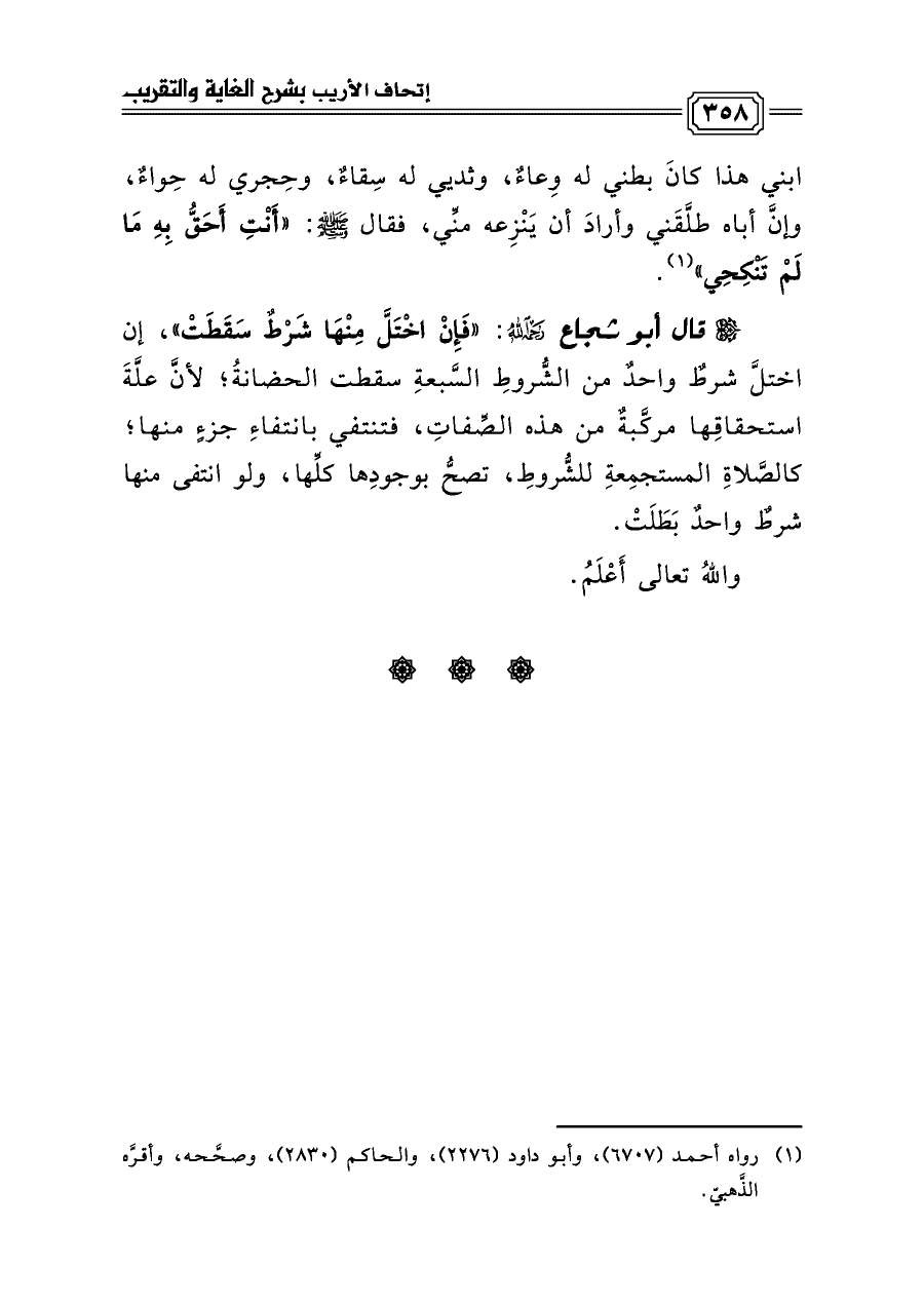 قال أبو شجاع رحمه الله: «فَإِنْ اخْتَلَّ مِنْهَا شَرْطٌ سَقَطَتْ»، إن اختلَّ شرطٌ واحدٌ من الشُّروطِ السَّبعةِ سقطت الحضانةُ؛ لأنَّ علَّةَ استحقاقِها مركَّبةٌ من هذه الصِّفاتِ، فتنتفي بانتفاءِ جزءٍ منها، كالصَّلاةِ المستجمِعةِ للشُّروطِ، تصحُّ بوجودِها كلِّها، ولو انتفى منها شرطٌ واحدٌ بَطَلَتْ.