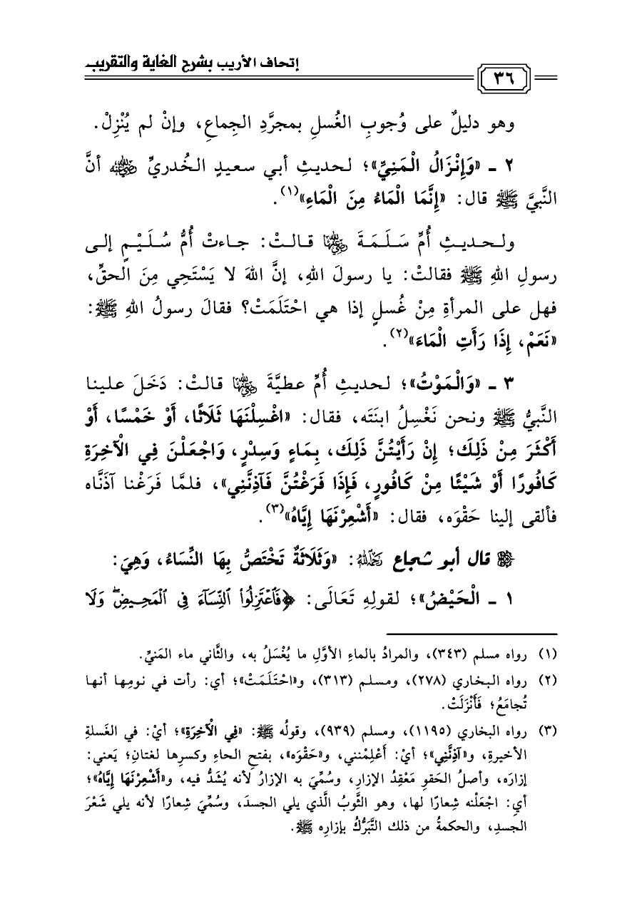 ولحديثِ أُمِّ سَلَمَةَ رضي الله عنها قالتْ: جاءتْ أُمُّ سُلَيْمٍ إلى رسولِ اللهِ صلى الله عليه وسلم فقالتْ: يا رسولَ اللهِ، إنَّ اللهَ لا يَسْتَحِي مِنَ الحقِّ، فهل على المرأةِ مِنْ غُسلٍ إذا هي احْتَلَمَتْ؟ فقالَ رسولُ اللهِ صلى الله عليه وسلم: «نَعَمْ، إِذَا رَأَتِ الْمَاءَ» (¬٢).