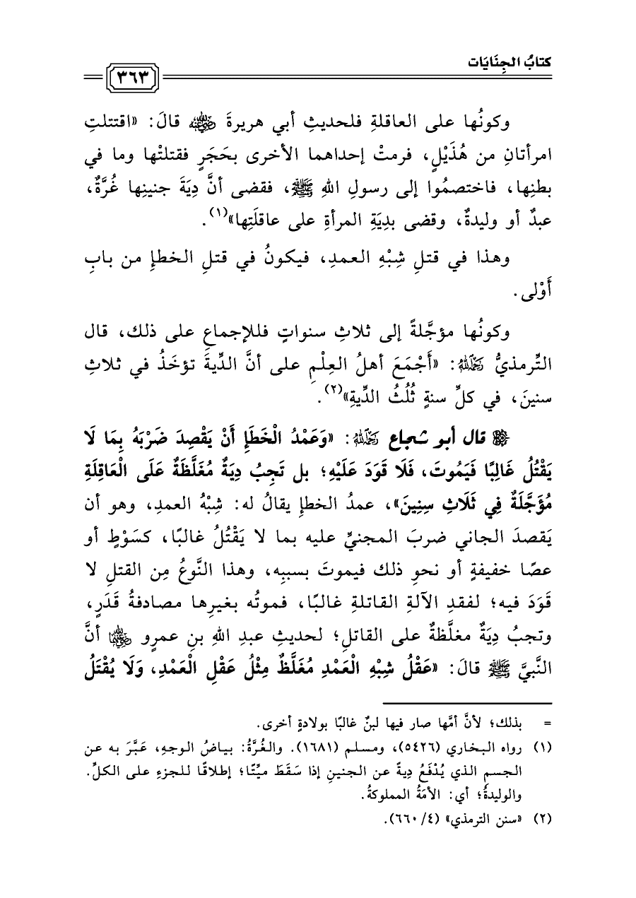 وكونُها على العاقلةِ فلحديثِ أبي هريرةَ رضي الله عنه قالَ: «اقتتلتِ امرأتانِ من هُذَيْلٍ، فرمتْ إحداهما الأخرى بحَجَرٍ فقتلتْها وما في بطنِها، فاختصمُوا إلى رسولِ اللهِ صلى الله عليه وسلم، فقضى أنَّ دِيَةَ جنينِها غُرَّةٌ، عبدٌ أو وليدةٌ، وقضى بدِيَةِ المرأةِ على عاقلَتِها» (¬١).