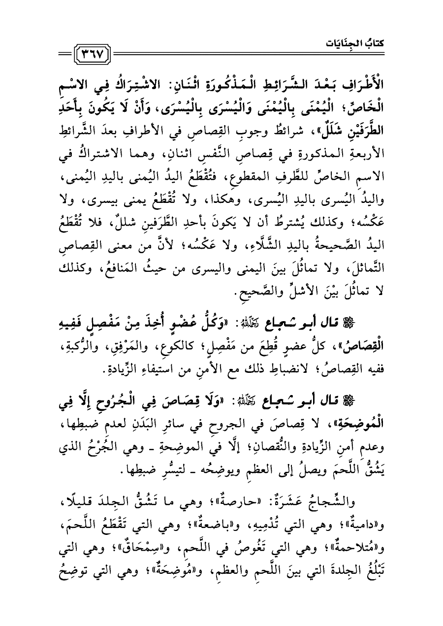 الْأَطْرَافِ بَعْدَ الشَّرَائِطِ الْمَذْكُورَةِ اثْنَانِ: الاشْتِرَاكُ فِي الاسْمِ الْخَاصِّ؛ الْيُمْنَى بِالْيُمْنَى وَالْيُسْرَى بِالْيُسْرَى، وَأَنْ لَا يَكُونَ بِأَحَدِ الطَّرَفَيْنِ شَلَلٌ»، شرائطُ وجوبِ القِصاصِ في الأطرافِ بعدَ الشَّرائطِ الأربعةِ المذكورةِ في قِصاصِ النَّفسِ اثنانِ، وهما الاشتراكُ في الاسمِ الخاصِّ للطَّرفِ المقطوعِ، فتُقْطَعُ اليدُ اليُمنى باليدِ اليُمنى، واليدُ اليُسرى باليدِ اليُسرى، وهكذا، ولا تُقْطَعُ يمنى بيسرى، ولا عَكْسُه؛ وكذلك يُشترطُ أن لا يَكونَ بأحدِ الطَّرَفينِ شللٌ، فلا تُقْطَعُ اليدُ الصَّحيحةُ باليدِ الشَّلَّاءِ، ولا عَكْسُه؛ لأنَّ من معنى القِصاصِ التَّماثلَ، ولا تماثُلَ بينَ اليمنى واليسرى من حيثُ المَنافعُ، وكذلك لا تماثُلَ بيْنَ الأشلِّ والصَّحيحِ.