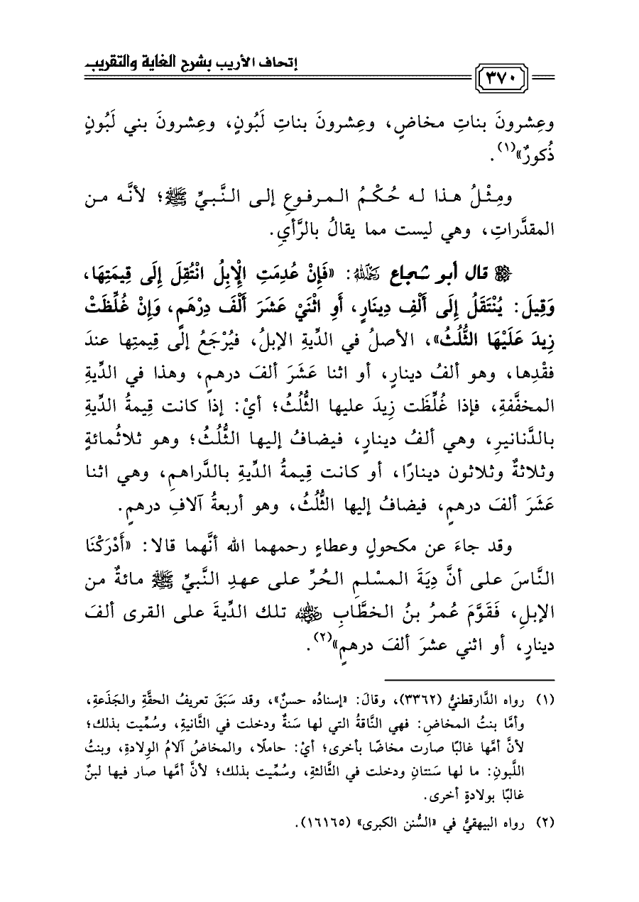 (¬١) رواه الدَّارقطنيُّ (٣٣٦٢)، وقالَ: «إسنادُه حسنٌ»، وقد سَبَقَ تعريفُ الحقَّةِ والجَذَعةِ، وأمَّا بنتُ المخاضِ: فهي النَّاقةُ التي لها سَنةٌ ودخلت في الثَّانيةِ، وسُمِّيت بذلك؛ لأنَّ أمَّها غالبًا صارت مخاضًا بأخرى؛ أيْ: حاملًا، والمخاضُ آلامُ الوِلادةِ، وبنتُ اللَّبونِ: ما لها سَنتانِ ودخلت في الثَّالثةِ، وسُمِّيت بذلك؛ لأنَّ أمَّها صار فيها لبنٌ غالبًا بولادةٍ أخرى.