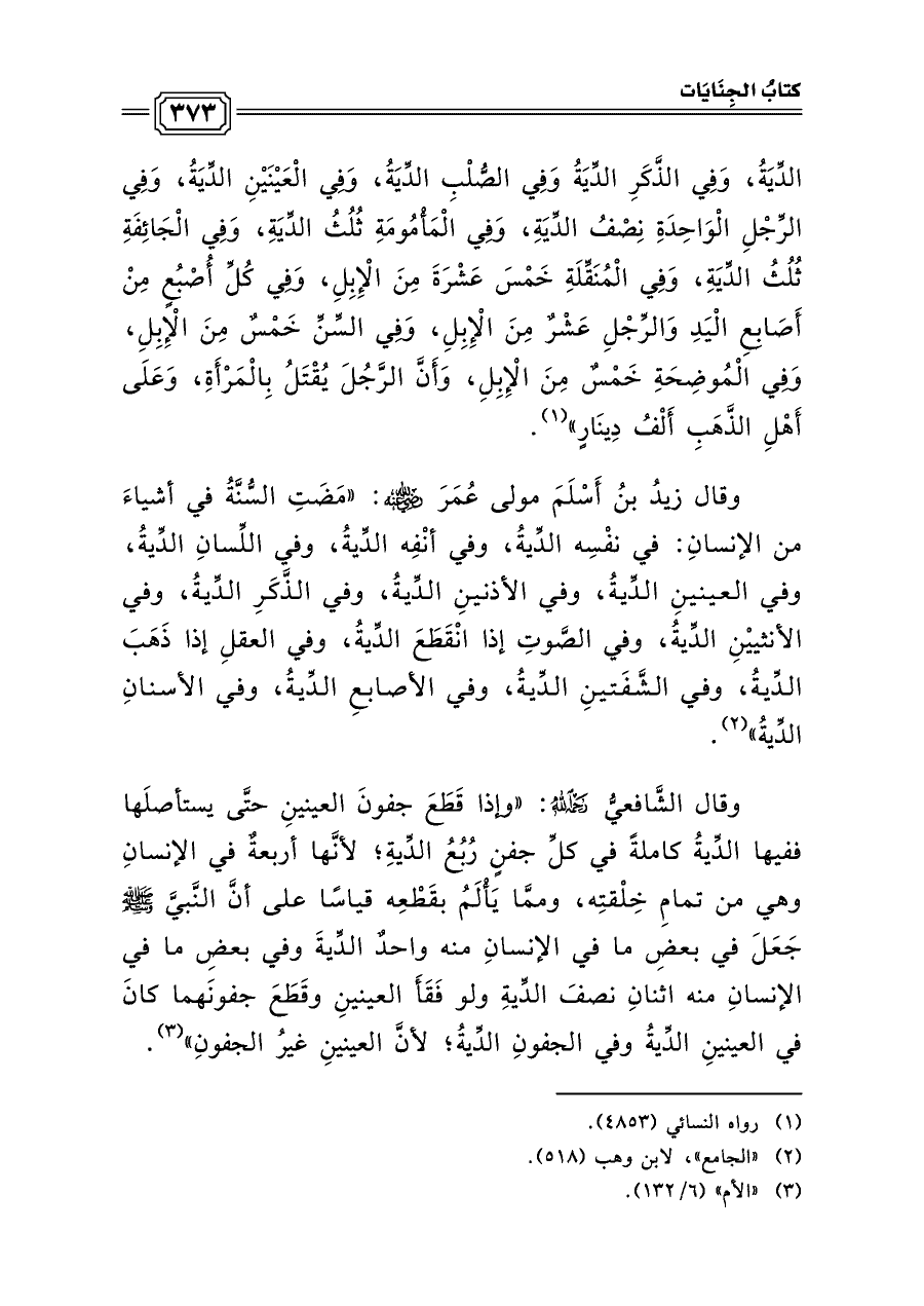 وقال زيدُ بنُ أَسْلَمَ مولى عُمَرَ رضي الله عنه: «مَضَتِ السُّنَّةُ في أشياءَ من الإنسانِ: في نفْسِه الدِّيةُ، وفي أنْفِه الدِّيةُ، وفي اللِّسانِ الدِّيةُ، وفي العينينِ الدِّيةُ، وفي الأذنينِ الدِّيةُ، وفي الذَّكَرِ الدِّيةُ، وفي الأنثييْنِ الدِّيةُ، وفي الصَّوتِ إذا انْقَطَعَ الدِّيةُ، وفي العقلِ إذا ذَهَبَ الدِّيةُ، وفي الشَّفَتينِ الدِّيةُ، وفي الأصابعِ الدِّيةُ، وفي الأسنانِ الدِّيةُ» (¬٢).