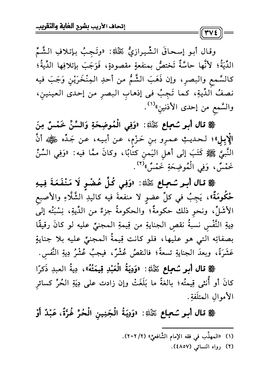 وقال أبو إسحاقَ الشِّيرازيُّ رحمه الله: «وتَجِبُ بإتلافِ الشَّمِّ الدِّيَةُ؛ لأنَّها حاسَّةٌ تَختصُّ بمنفعةٍ مقصودةٍ، فَوَجَبَ بإتلافِها الدِّيةُ، كالسَّمعِ والبصرِ، وإن ذَهَبَ الشَّمُّ من أحدِ المِنْخَرَيْنِ وَجَبَ فيه نصفُ الدِّيةِ، كما تَجِبُ فى إذهابِ البصرِ من إحدى العينينِ، والسَّمعِ من إحدى الأذنينِ» (¬١).