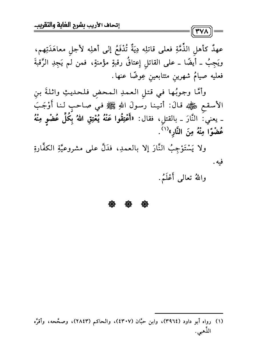 وأمَّا وجوبُها في قتلِ العمدِ المحضِ فلحديثِ واثلةَ بنِ الأسقعِ رضي الله عنه قالَ: أتينا رسولَ اللهِ صلى الله عليه وسلم في صاحبٍ لنا أَوْجَبَ -يعني النَّارَ- بالقتلِ، فقال: «أَعْتِقُوا عَنْهُ يُعْتِقِ اللهُ بِكُلِّ عُضْوٍ مِنْهُ عُضْوًا مِنْهُ مِنَ النَّارِ» (¬١).