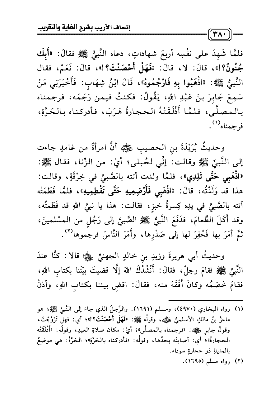 (¬١) رواه البخاري (٤٩٧٠)، ومسلم (١٦٩١). والرَّجلُ الذي جاءَ إلى النَّبيِّ صلى الله عليه وسلم؛ هو ماعزُ بنُ مالكٍ الأسلميُّ رضي الله عنه، وقولُه صلى الله عليه وسلم: «فَهَلْ أَحْصَنْتَ؟!»؛ أي: فهل تَزَوَّجْتَ، وقولُ جابرٍ رضي الله عنه: «فرجمناه بالمصلَّى»؛ أيْ: مكان صلاةِ العيدِ، وقولُه: «أَذْلَقَتْه الحجارةُ»؛ أي: أصابتْه بحدِّها، وقولُه: «فأدركناه بالحَرَّةِ»؛ الحَرَّةُ: هي موضعٌ بالمدينةِ ذو حجارةٍ سوداء.
