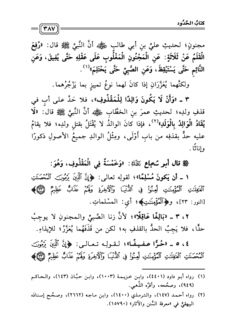 ١ - أن يَكونَ مُسْلِمًا»؛ لقولِه تعالى: {إِنَّ الَّذِينَ يَرْمُونَ الْمُحْصَنَاتِ الْغَافِلَاتِ الْمُؤْمِنَاتِ لُعِنُوا فِي الدُّنْيَا وَالْآخِرَةِ وَلَهُمْ عَذَابٌ عَظِيمٌ} [النور: ٢٣]، و {الْمُؤْمِنَاتِ}؛ أيِ: المسْلماتِ.