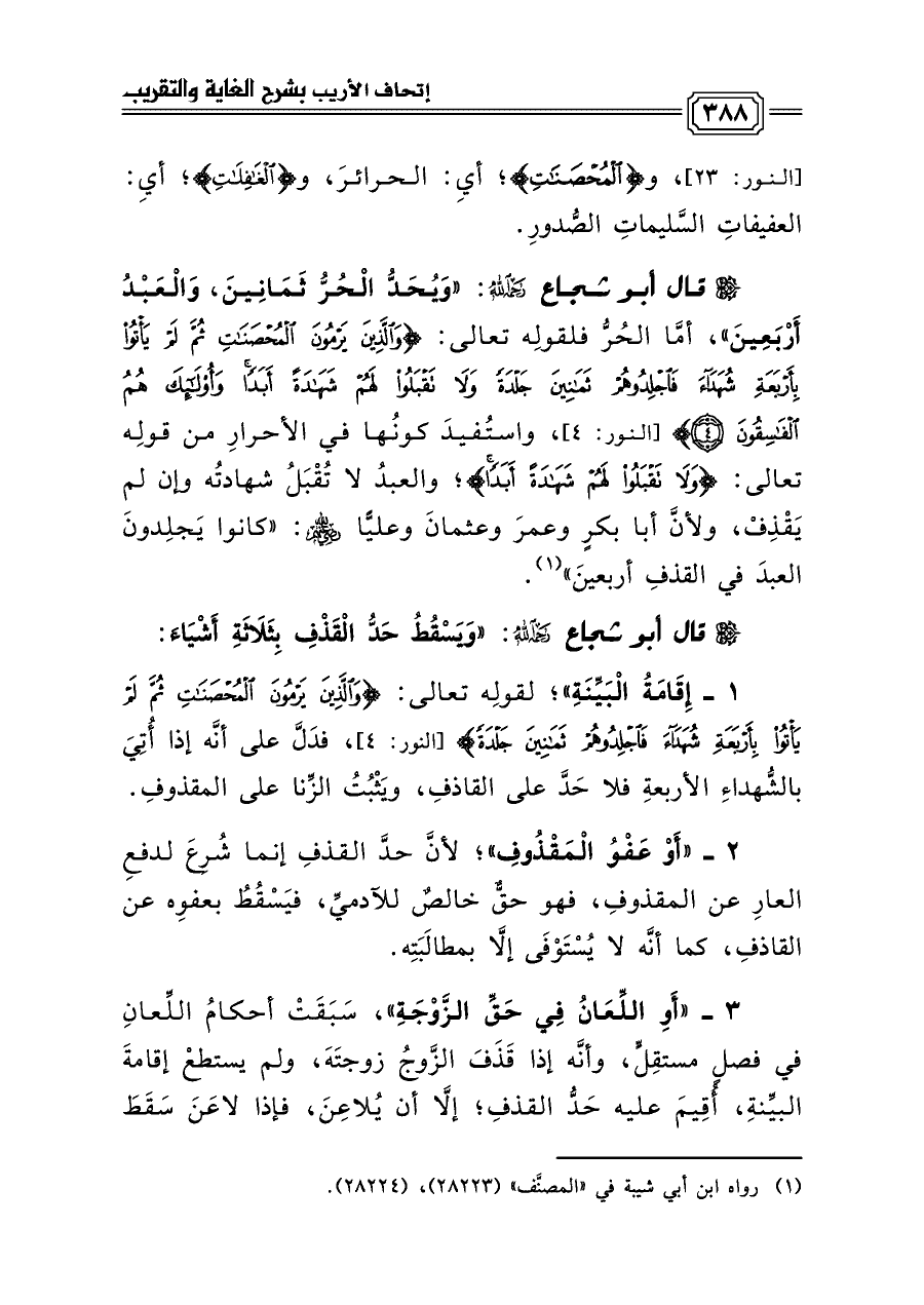 قال أبو شجاع رحمه الله: «وَيَسْقُطُ حَدُّ الْقَذْفِ بِثَلَاثَةِ أَشْيَاءَ: