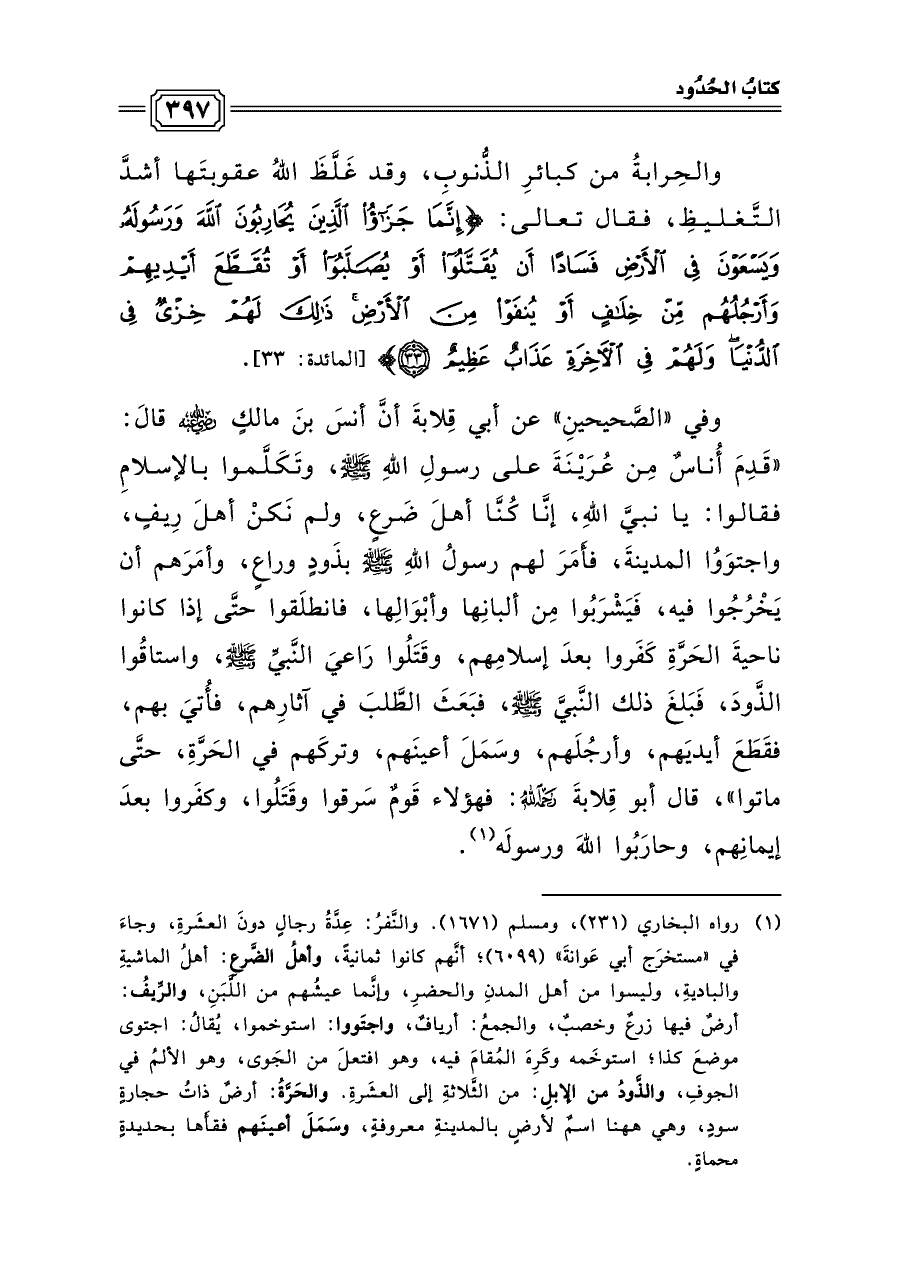 وفي الصَّحيحينِ عن أبي قِلابةَ أنَّ أنسَ بنَ مالكٍ رضي الله عنه قالَ: «قَدِمَ أُناسٌ مِن عُرَيْنَةَ على رسولِ اللهِ صلى الله عليه وسلم، وتَكَلَّموا بالإسلامِ فقالوا: يا نبيَّ اللهِ، إنَّا كُنَّا أهلَ ضَرعٍ، ولم نَكنْ أهلَ رِيفٍ، واجتوَوُا المدينةَ، فأَمَرَ لهم رسولُ اللهِ صلى الله عليه وسلم بذَودٍ وراعٍ، وأمَرَهم أن يَخْرُجُوا فيه، فَيَشْرَبُوا مِن ألبانِها وأبْوَالِها، فانطلَقوا حتَّى إذا كانوا ناحيةَ الحَرَّةِ كَفَروا بعدَ إسلامِهم، وقَتَلُوا رَاعيَ النَّبيِّ صلى الله عليه وسلم، واستاقُوا الذَّودَ، فَبَلغَ ذلك النَّبيَّ صلى الله عليه وسلم، فبَعَثَ الطَّلبَ في آثارِهم، فأُتيَ بهم، فقَطَعَ أيديَهم، وأرجُلَهم، وسَمَلَ أعينَهم، وتركَهم في الحَرَّةِ، حتَّى ماتوا»، قال أبو قِلابةَ رحمه الله: فهؤلاء قَومٌ سَرقوا وقَتَلُوا، وكفَروا بعدَ إيمانِهم، وحارَبُوا اللهَ ورسولَه (¬١).