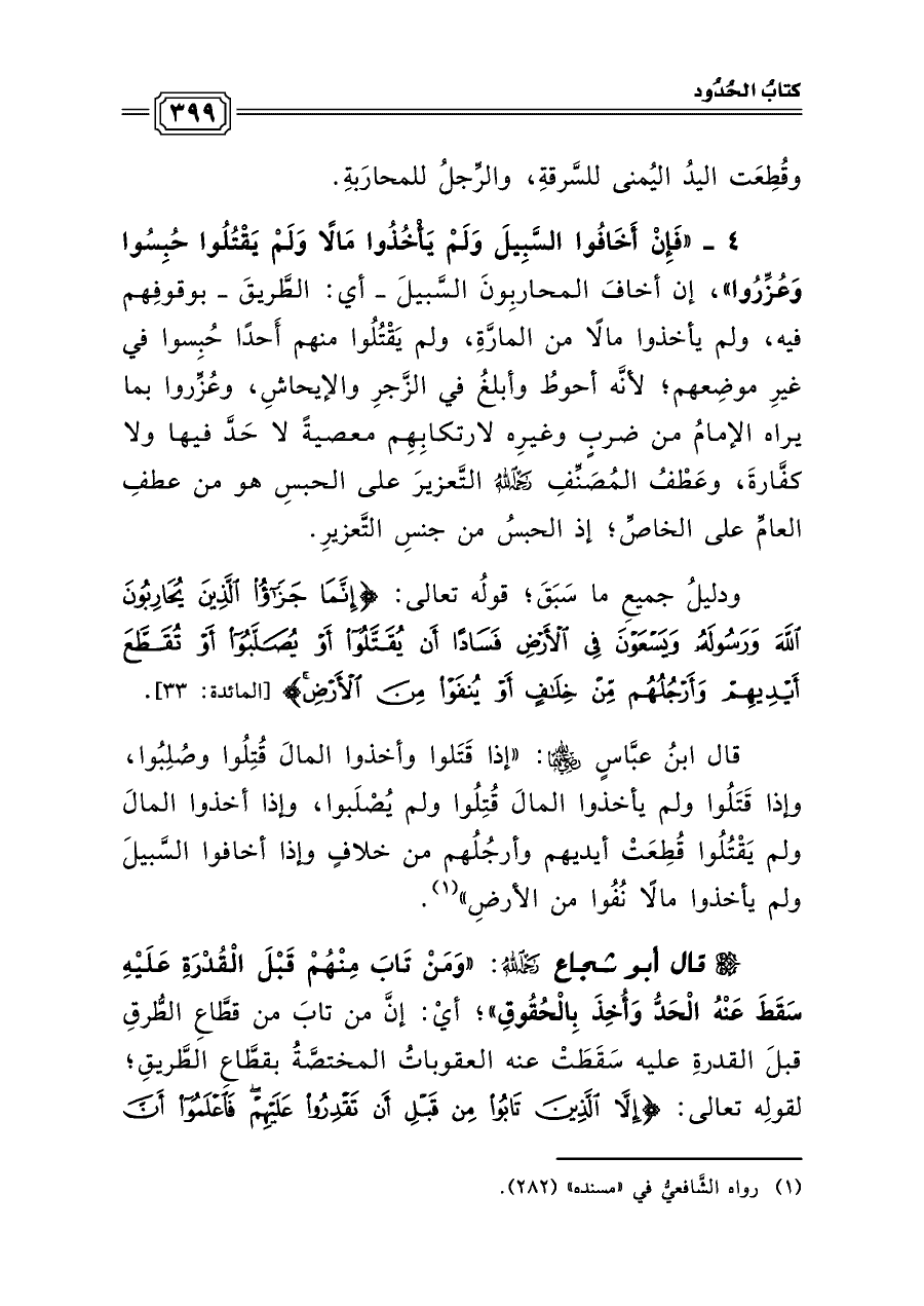 ٤ - «فَإِنْ أَخَافُوا السَّبِيلَ وَلَمْ يَأْخُذُوا مَالًا وَلَمْ يَقْتُلُوا حُبِسُوا وَعُزِّرُوا»، إن أخافَ المحاربِونَ السَّبيلَ -أي: الطَّريقَ- بوقوفِهم فيه، ولم يأخذوا مالًا من المارَّةِ، ولم يَقْتُلُوا منهم أَحدًا حُبِسوا في غيرِ موضِعهم؛ لأنَّه أحوطُ وأبلغُ في الزَّجرِ والإيحاشِ، وعُزِّروا بما يراه الإمامُ من ضربٍ وغيرِه لارتكابِهِم معصيةً لا حَدَّ فيها ولا كفَّارةَ، وعَطْفُ المُصَنِّفِ رحمه الله التَّعزيرَ على الحبسِ هو من عطفِ العامِّ على الخاصِّ؛ إذ الحبسُ من جنسِ التَّعزيرِ.