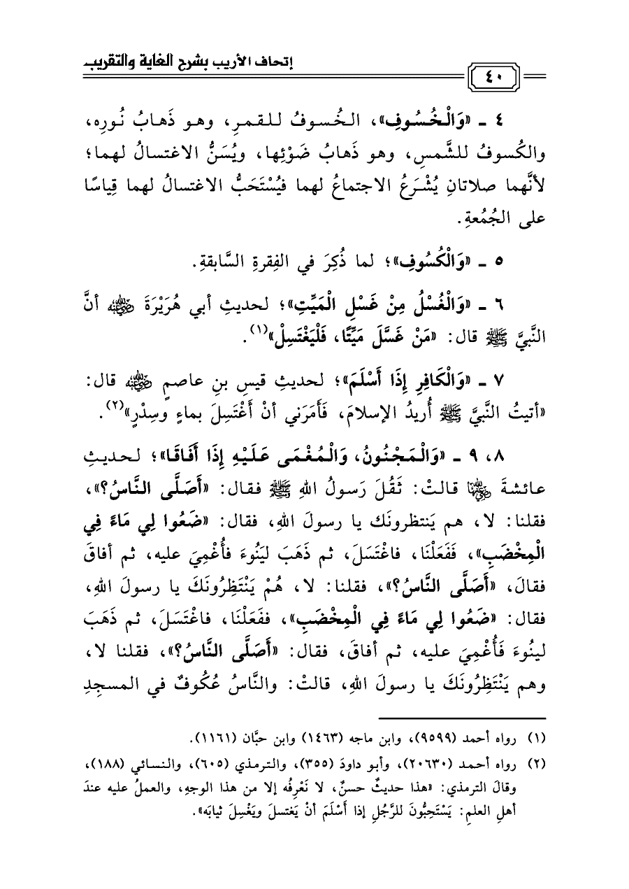 ٤ - «وَالْخُسُوفِ»، الخُسوفُ للقمرِ، وهو ذَهابُ نُورِه، والكُسوفُ للشَّمسِ، وهو ذَهابُ ضَوْئِها، ويُسَنُّ الاغتسالُ لهما؛ لأنَّهما صلاتانِ يُشْرَعُ الاجتماعُ لهما فيُسْتَحَبُّ الاغتسالُ لهما قِياسًا على الجُمُعةِ.