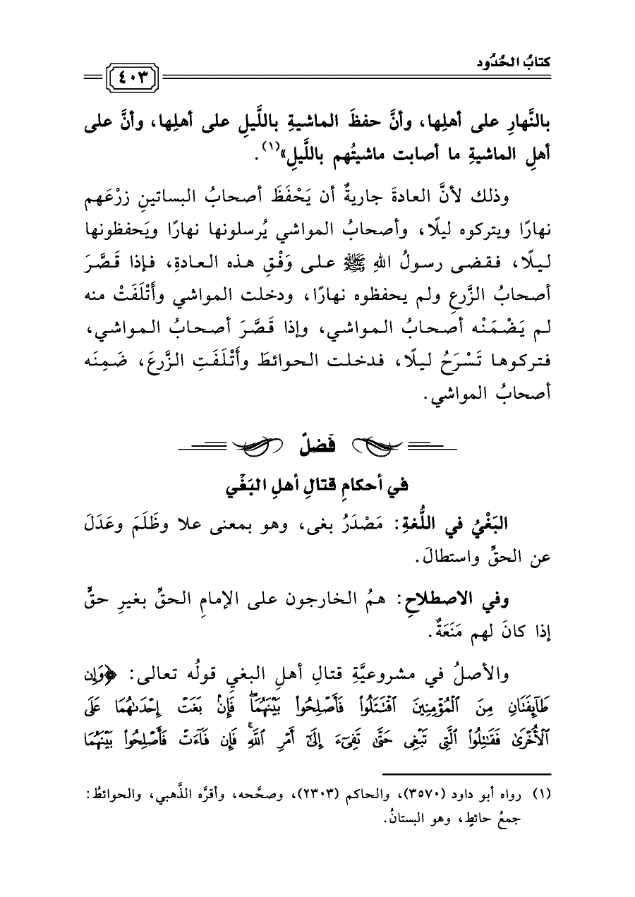بالنَّهارِ على أهلِها، وأنَّ حفظَ الماشيةِ باللَّيلِ على أهلِها، وأنَّ على أهلِ الماشيةِ ما أصابت ماشيتُهم باللَّيلِ» (¬١).