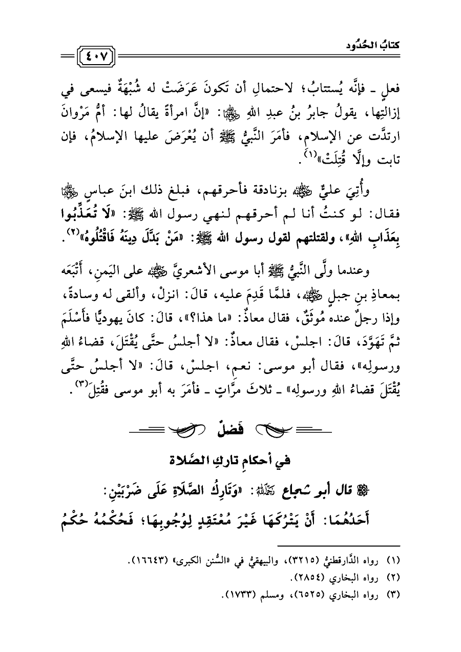 وأُتِيَ عليٌّ رضي الله عنه بزنادقة فأحرقهم، فبلغ ذلك ابنَ عباسٍ رضي الله عنهما فقال: لو كنتُ أنا لم أحرقهم لنهي رسول الله صلى الله عليه وسلم: «لَا تُعَذِّبُوا بِعَذَابِ اللهِ»، ولقتلتهم لقول رسول الله صلى الله عليه وسلم: «مَنْ بَدَّلَ دِينَهُ فَاقْتُلُوهُ» (¬٢).