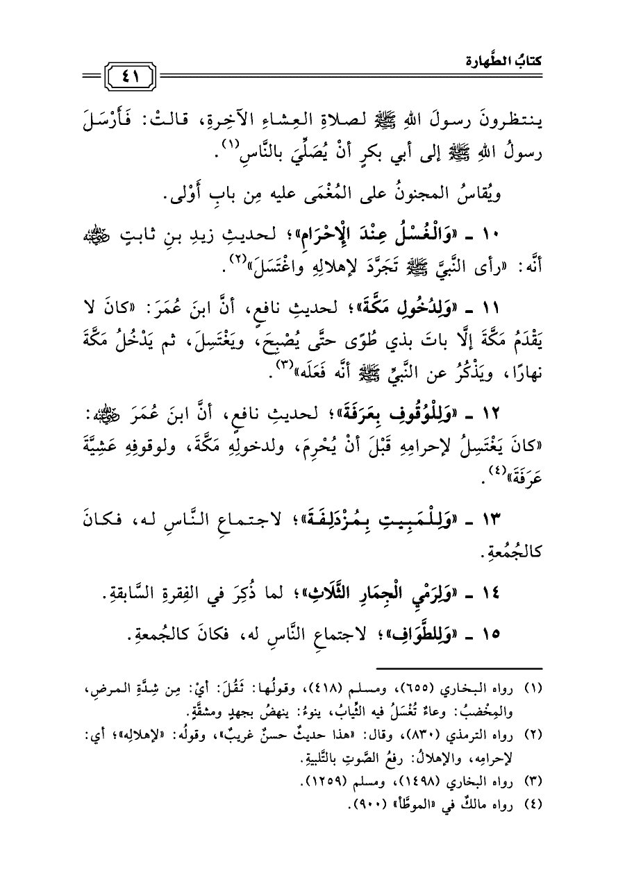 ١٢ - «وَلِلْوُقُوفِ بِعَرَفَةَ»؛ لحديثِ نافعٍ، أنَّ ابنَ عُمَرَ رضي الله عنه: «كانَ يَغْتَسِلُ لإحرامِهِ قَبْلَ أنْ يُحْرِمَ، ولدخولِهِ مَكَّةَ، ولوقوفِهِ عَشِيَّةَ عَرَفَةَ» (¬٤).