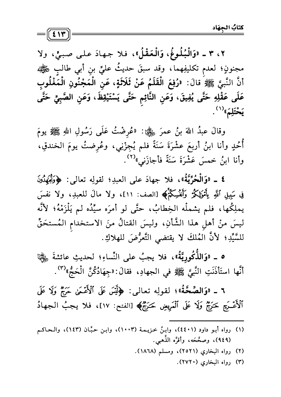 ٢، ٣ - «وَالْبُلُوغُ، وَالْعَقْلُ»، فلا جهادَ على صبيٍّ، ولا مجنونٍ؛ لعدمِ تكليفِهما، وقد سبقَ حديثُ عليِّ بنِ أبي طالبٍ رضي الله عنه أنَّ النَّبيَّ صلى الله عليه وسلم قالَ: «رُفِعَ الْقَلَمُ عَنْ ثَلَاثَةٍ، عَنِ الْمَجْنُونِ الْمَغْلُوبِ عَلَى عَقْلِهِ حَتَّى يُفِيقَ، وَعَنِ النَّائِمِ حَتَّى يَسْتَيْقِظَ، وَعَنِ الصَّبِيِّ حَتَّى يَحْتَلِمَ» (¬١).