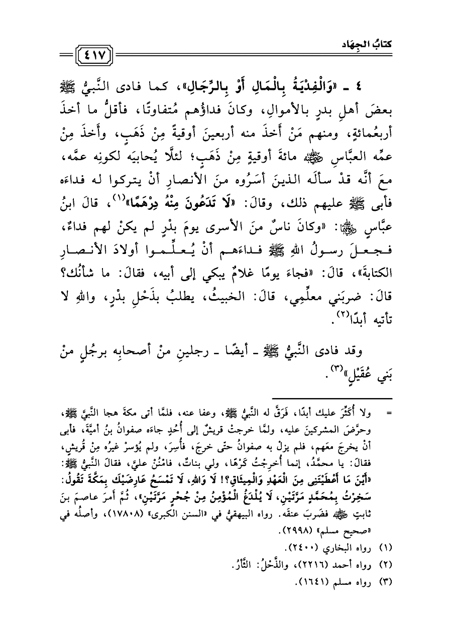 ٤ - «وَالْفِدْيَةُ بِالْمَالِ أَوْ بِالرِّجَالِ»، كما فادى النَّبيُّ صلى الله عليه وسلم بعضَ أهلِ بدرٍ بالأموالِ، وكانَ فداؤُهم مُتفاوتًا، فأقلُّ ما أخذَ أربعُمائةٍ، ومنهم مَنْ أَخذَ منه أربعينَ أوقيةً مِنْ ذَهَبٍ، وأَخذَ مِنْ عمِّه العبَّاسِ رضي الله عنه مائةَ أوقيةٍ مِنْ ذَهَبٍ؛ لئلَّا يُحابيَه لكونِه عمَّه، معَ أنَّه قدْ سألَه الذينَ أسَرُوه منَ الأنصارِ أنْ يتركوا له فداءَه فأبى صلى الله عليه وسلم عليهم ذلك، وقالَ: «لَا تَدَعُونَ مِنْهُ دِرْهَمًا» (¬١)، قالَ ابنُ عبَّاسٍ رضي الله عنهما: «وكانَ ناسٌ منَ الأسرى يومَ بدْرٍ لم يكنْ لهم فداءٌ، فجعلَ رسولُ اللهِ صلى الله عليه وسلم فداءَهم أنْ يُعلِّموا أولادَ الأنصارِ الكتابةَ»، قالَ: «فجاءَ يومًا غلامٌ يبكي إلى أبيه، فقالَ: ما شأنُك؟ قالَ: ضربَني معلِّمِي، قالَ: الخبيثُ، يطلبُ بذَحْلِ بدْرٍ، واللهِ لا تأتيه أبدًا (¬٢).