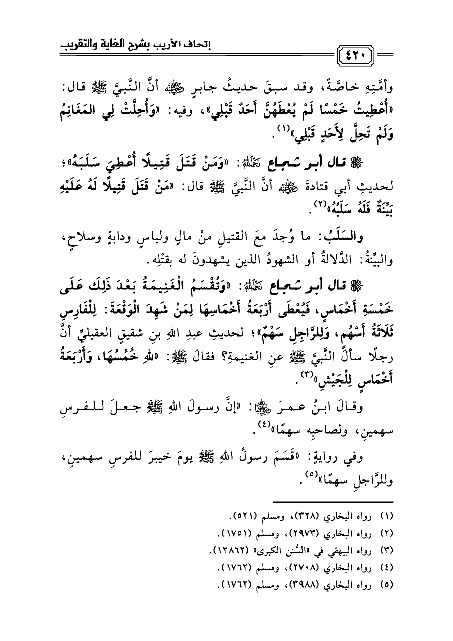 قال أبو شجاع رحمه الله: «وَتُقْسَمُ الْغَنِيمَةُ بَعْدَ ذَلِكَ عَلَى خَمْسَةِ أَخْمَاسٍ، فَيُعْطَى أَرْبَعَةُ أَخْمَاسِهَا لِمَنْ شَهِدَ الْوَقْعَةَ: لِلْفَارِسِ ثَلَاثَةُ أَسْهُمٍ، وَلِلرَّاجِلِ سَهْمٌ»؛ لحديثِ عبدِ اللهِ بنِ شقيقٍ العقيليِّ أنَّ رجلًا سألَ النَّبيَّ صلى الله عليه وسلم عنِ الغنيمةِ؟ فقالَ صلى الله عليه وسلم: «للهِ خُمُسُهَا، وَأَرْبَعَةُ أَخْمَاسٍ لِلْجَيْشِ» (¬٣).