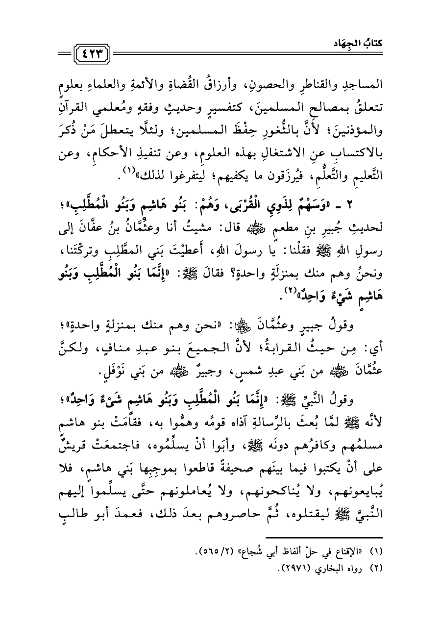 ٢ - «وَسَهْمٌ لِذَوِيِ الْقُرْبَى، وَهُمْ: بَنُو هَاشِمٍ وَبَنُو الْمُطَّلِبِ»؛ لحديثِ جُبيرِ بنِ مطعمٍ رضي الله عنه قال: مشيتُ أنا وعثُمَّانُ بنُ عفَّانَ إلى رسولِ اللهِ صلى الله عليه وسلم فقلْنا: يا رسولَ اللهِ، أَعطيْتَ بَني المطَّلِبِ وتركْتَنا، ونحنُ وهم منك بمنزلَةٍ واحدةٍ؟ فقالَصلى الله عليه وسلم: «إِنَّمَا بَنُو الْمُطَّلِبِ وَبَنُو هَاشِمٍ شَيْءٌ وَاحِدٌ» (¬٢).