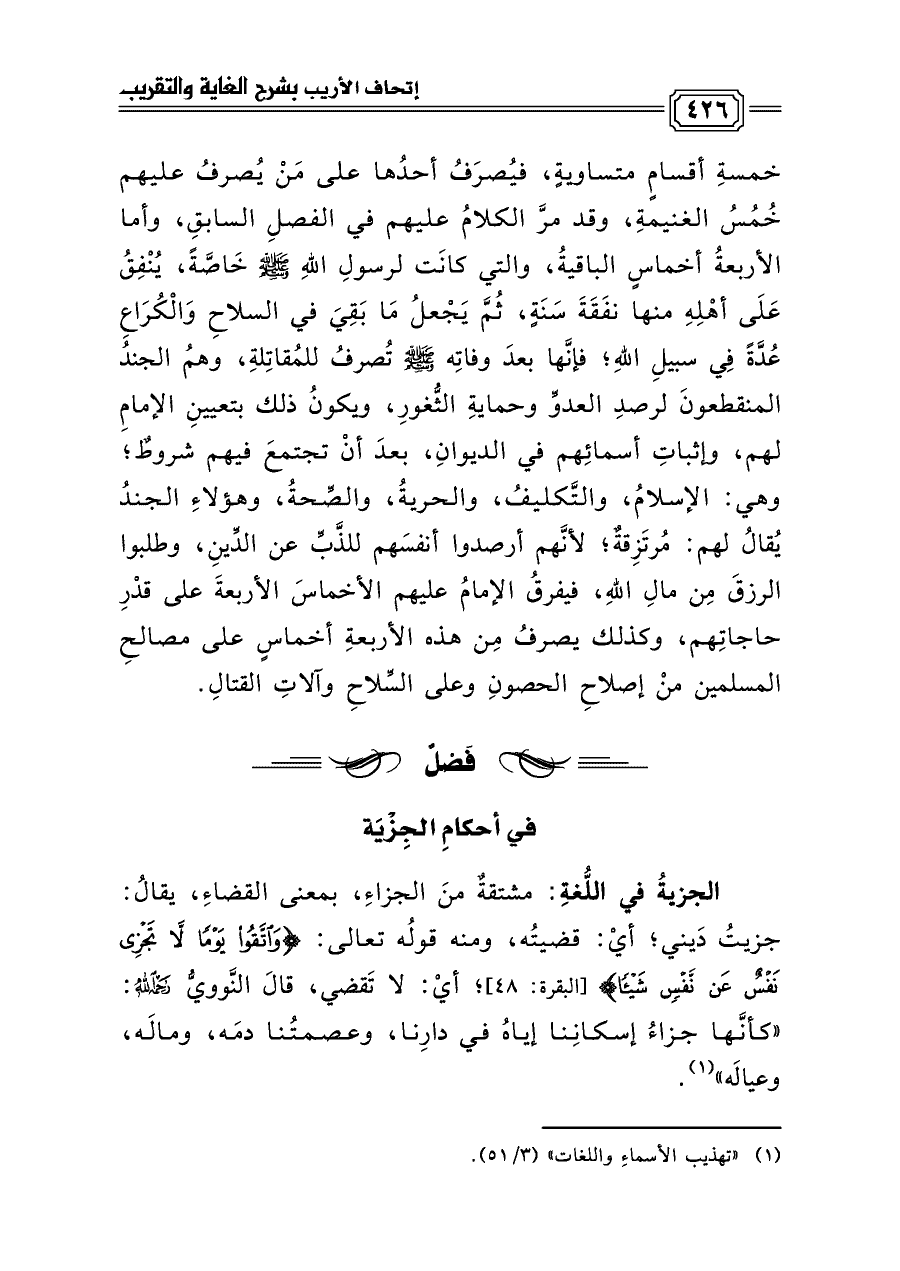 خمسةِ أقسامٍ متساويةٍ، فيُصرَفُ أحدُها على مَنْ يُصرفُ عليهم خُمُسُ الغنيمةِ، وقد مرَّ الكلامُ عليهم في الفصلِ السابقِ، وأما الأربعةُ أخماسٍ الباقيةُ، والتي كانَت لرسولِ اللهِ صلى الله عليه وسلم خَاصَّةً، يُنْفِقُ عَلَى أهْلِهِ منها نفَقَةَ سَنَةٍ، ثُمَّ يَجْعلُ مَا بَقِيَ في السلاحِ وَالْكُرَاعِ عُدَّةً فِي سبيلِ اللهِ؛ فإنَّها بعدَ وفاتِه صلى الله عليه وسلم تُصرفُ للمُقاتِلةِ، وهمُ الجندُ المنقطعونَ لرصدِ العدوِّ وحمايةِ الثُّغورِ، ويكونُ ذلك بتعيينِ الإمامِ لهم، وإثباتِ أسمائِهم في الديوانِ، بعدَ أنْ تجتمعَ فيهم شروطٌ؛ وهي: الإسلامُ، والتَّكليفُ، والحريةُ، والصِّحةُ، وهؤلاءِ الجندُ يُقالُ لهم: مُرتَزِقةٌ؛ لأنَّهم أرصدوا أنفسَهم للذَّبِّ عن الدِّينِ، وطلبوا الرزقَ مِن مالِ اللهِ، فيفرقُ الإمامُ عليهم الأخماسَ الأربعةَ على قدْرِ حاجاتِهم، وكذلك يصرفُ مِن هذه الأربعةِ أخماسٍ على مصالحِ المسلمين منْ إصلاحِ الحصونِ وعلى السِّلاحِ وآلاتِ القتالِ.