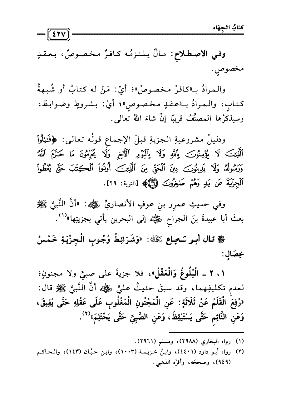 ١، ٢ - الْبُلُوغُ وَالْعَقْلُ»، فلا جزيةَ على صبيٍّ ولا مجنونٍ؛ لعدمِ تكليفِهما، وقد سبقَ حديثُ عليٍّ رضي الله عنه أنَّ النَّبيَّ صلى الله عليه وسلم قالَ: «رُفِعَ الْقَلَمُ عَنْ ثَلَاثَةٍ: عَنِ الْمَجْنُونِ الْمَغْلُوبِ عَلَى عَقْلِهِ حَتَّى يُفِيقَ، وَعَنِ النَّائِمِ حَتَّى يَسْتَيْقِظَ، وَعَنِ الصَّبِيِّ حَتَّى يَحْتَلِمَ» (¬٢).