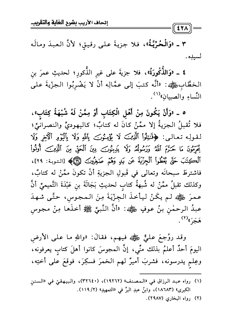 ٥ - «وَأَنْ يَكُونَ مِنْ أَهْلِ الْكِتَابِ أَوْ مِمَّنْ لَهُ شُبْهَةُ كِتَابٍ»، فلا تُقبلُ الجزيةُ إلا ممَّنْ كانَ له كتابٌ، كاليهوديِّ والنصرانيِّ؛ لقولِه تعالى: {قَاتِلُوا الَّذِينَ لَا يُؤْمِنُونَ بِاللهِ وَلَا بِالْيَوْمِ الْآخِرِ وَلَا يُحَرِّمُونَ مَا حَرَّمَ اللهُ وَرَسُولُهُ وَلَا يَدِينُونَ دِينَ الْحَقِّ مِنَ الَّذِينَ أُوتُوا الْكِتَابَ حَتَّى يُعْطُوا الْجِزْيَةَ عَنْ يَدٍ وَهُمْ صَاغِرُونَ} [التوبة: ٢٩]، فاشترطَ سبحانَه وتعالى في قَبولِ الجزيةِ أنْ تكونَ ممَّنْ له كتابٌ، وكذلك تقبلُ ممَّنْ له شُبهةُ كتابٍ لحديثِ بَجَالَةَ بنِ عَبْدَةَ التَّميميِّ أنَّ عمرَ رضي الله عنه لم يكَنْ ليأخذَ الجِزْيَةَ مِنَ المجوسِ، حتَّى شهدَ عبدُ الرحمنِ بنُ عوفٍ رضي الله عنه: «أنَّ النَّبيَّ صلى الله عليه وسلم أخذَها مِنْ مجوسِ هَجَرَ» (¬٢).