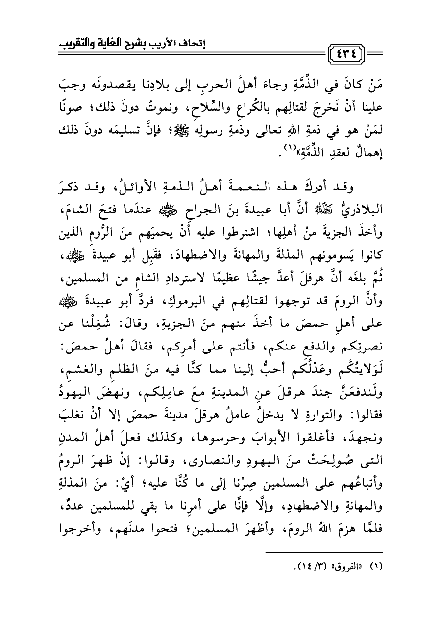 مَنْ كانَ في الذِّمَّةِ وجاءَ أهلُ الحربِ إلى بلادِنا يقصدونَه وجبَ علينا أنْ نَخرجَ لقتالِهم بالكُراعِ والسِّلاحِ، ونموتُ دونَ ذلك؛ صونًا لمَنْ هو في ذمةِ اللهِ تعالى وذمةِ رسولِه صلى الله عليه وسلم؛ فإنَّ تسليمَه دونَ ذلك إهمالٌ لعقدِ الذِّمَّةِ» (¬١).