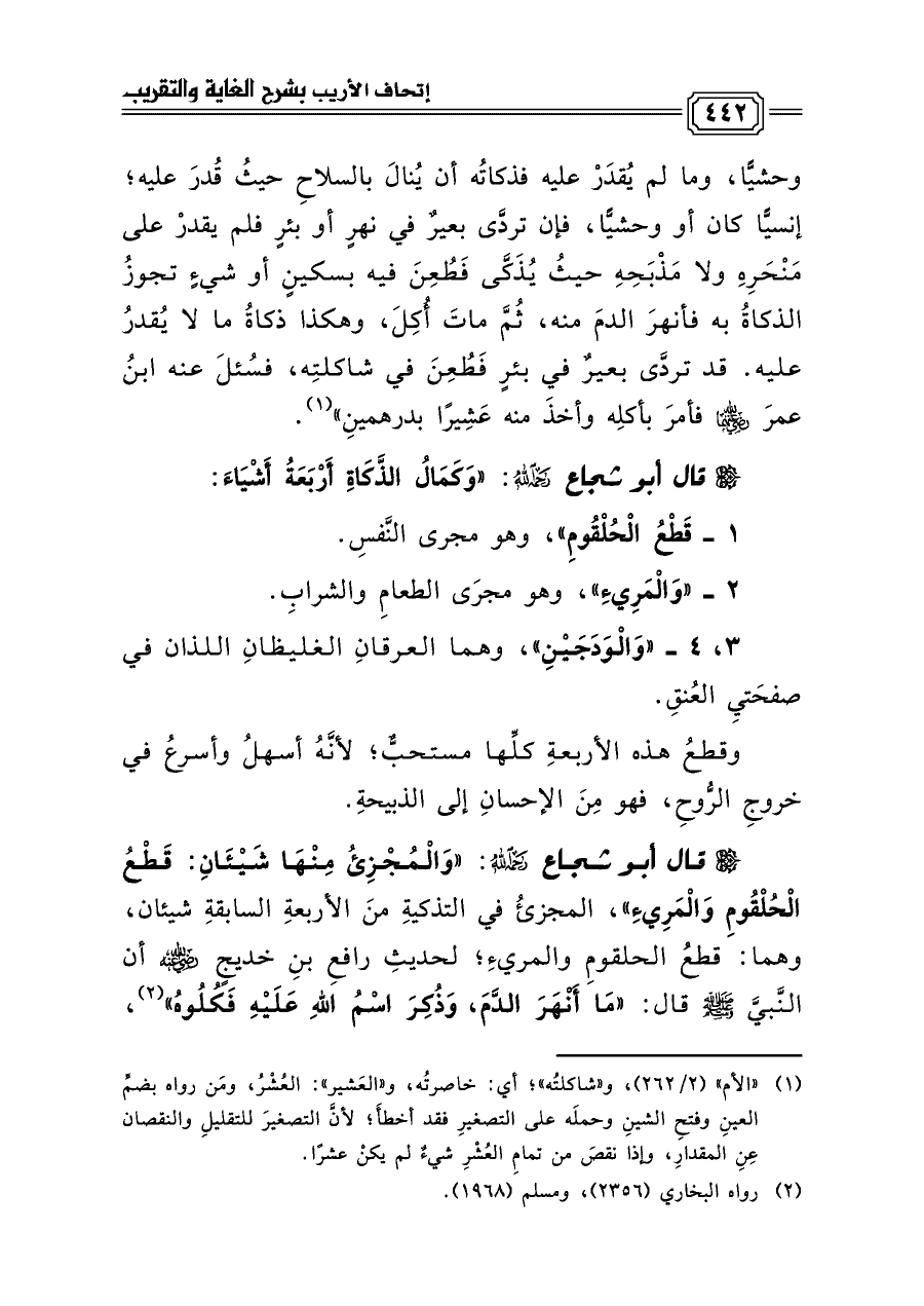 قال أبو شجاع رحمه الله: «وَالْمُجْزِئُ مِنْهَا شَيْئَانِ: قَطْعُ الْحُلْقُومِ وَالْمَرِيءِ»، المجزئُ في التذكيةِ منَ الأربعةِ السابقةِ شيئان، وهما: قطعُ الحلقومِ والمريءِ؛ لحديثِ رافعِ بنِ خديجٍ رضي الله عنه أن النَّبيَّ صلى الله عليه وسلم قالَ: «مَا أَنْهَرَ الدَّمَ، وَذُكِرَ اسْمُ اللهِ عَلَيْهِ فَكُلُوهُ» (¬٢)،