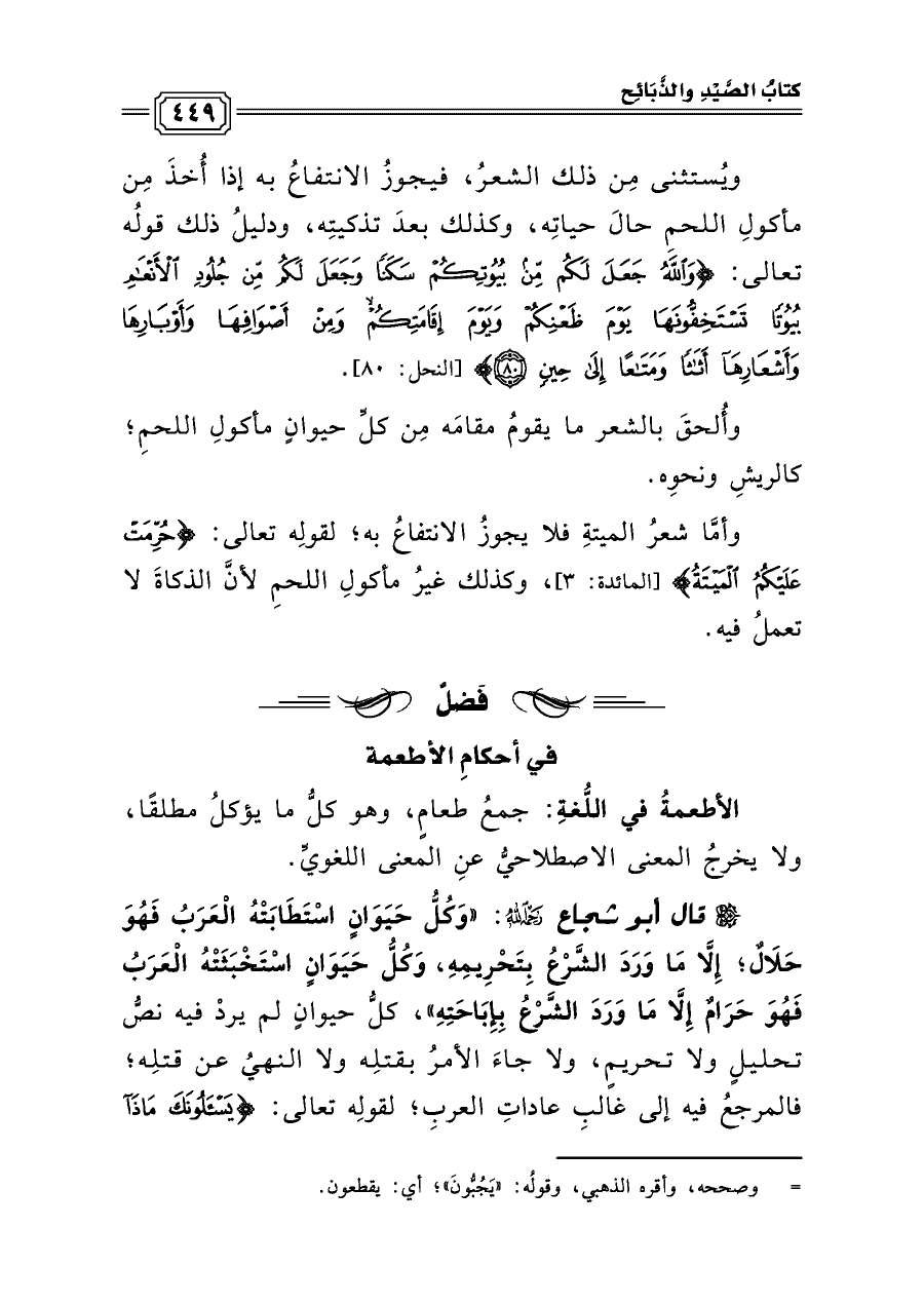 قال أبو شجاع رحمه الله: «وَكُلُّ حَيَوَانٍ اسْتَطَابَتْهُ الْعَرَبُ فَهُوَ حَلَالٌ؛ إِلَّا مَا وَرَدَ الشَّرْعُ بِتَحْرِيمِهِ، وَكُلُّ حَيَوَانٍ اسْتَخْبَثَتْهُ الْعَرَبُ فَهُوَ حَرَامٌ إِلَّا مَا وَرَدَ الشَّرْعُ بِإِبَاحَتِهِ»، كلُّ حيوانٍ لم يردْ فيه نصُّ تحليلٍ ولا تحريمٍ، ولا جاءَ الأمرُ بقتلِه ولا النهيُ عن قتلِه؛ فالمرجعُ فيه إلى غالبِ عاداتِ العربِ؛ لقولِه تعالى: {يَسْأَلُونَكَ مَاذَا
