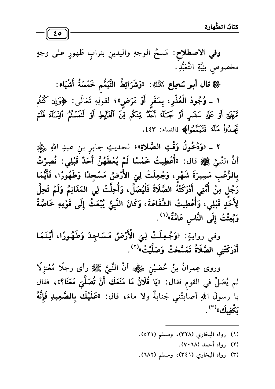 وروى عِمرانُ بنُ حُصَيْنٍ رضي الله عنه أنَّ النَّبيَّ صلى الله عليه وسلم رأى رجلًا مُعْتزِلًا لم يُصَلِّ في القومِ فقال: «يَا فُلَانُ مَا مَنَعَكَ أَنْ تُصَلِّيَ مَعَنَا؟»، فقال يا رسولَ اللهِ أصابتْني جَنابةٌ ولا ماءَ، قال: «عَلَيْكَ بِالصَّعِيدِ فَإِنَّهُ يَكْفِيكَ» (¬٣).
