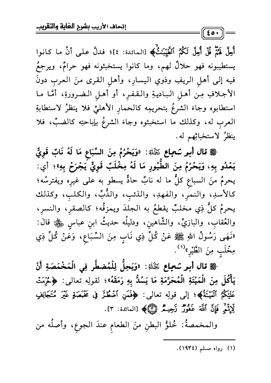 قال أبو شجاع رحمه الله: «وَيَحْرُمُ مِنَ السِّبَاعِ مَا لَهُ نَابٌ قَوِيٌّ يَعْدُو بِهِ، وَيَحْرُمُ مِنَ الطُّيُورِ مَا لَهُ مِخْلَبٌ قَوِيٌّ يَجْرَحُ بِهِ»؛ أي: يحرمُ منَ السباعِ كلُّ ما له نابٌ حادٌّ يسطو به على غيرِه ويفترسُه، كالأسدِ، والنمرِ، والفهدِ، والذئبِ، والدُّبِّ، والكلبِ، وكذلك يحرمُ كلُّ ذِي مخلبٌ يقطعُ به الجلدَ ويمزقُه، كالصقرِ، والنسرِ، والعُقابِ، والبازيِّ، والشَّاهينِ، ودليلُه حديثُ ابنِ عباسٍ رضي الله عنهما قالَ: «نَهَى رَسُولُ اللهِ صلى الله عليه وسلم عَنْ كُلِّ ذِي نَابٍ مِنَ السِّبَاعِ، وَعَنْ كُلِّ ذِي مِخْلَبٍ مِنَ الطَّيْرِ» (¬١).