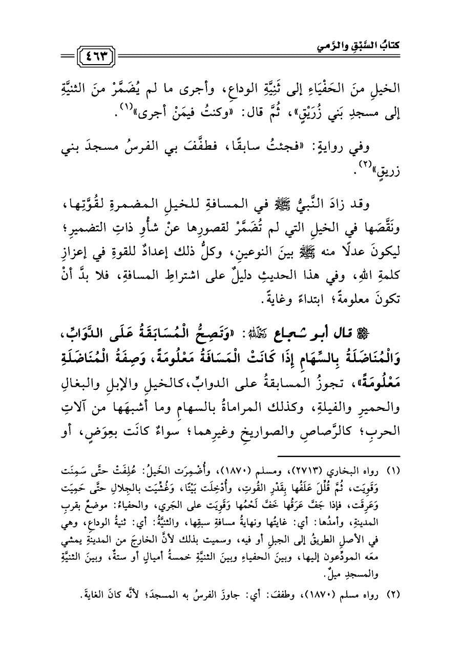 قال أبو شجاع رحمه الله: «وَتَصِحُّ الْمُسَابَقَةُ عَلَى الدَّوَابِّ، وَالْمُنَاضَلَةُ بِالسِّهَامِ إِذَا كَانَتْ الْمَسَافَةُ مَعْلُومَةً، وَصِفَةُ الْمُنَاضَلَةِ مَعْلُومَةً»، تجوزُ المسابقةُ على الدوابِّ، كالخيلِ والإبلِ والبغالِ والحميرِ والفيلةِ، وكذلك المراماةُ بالسهامِ وما أشبهَها من آلاتِ الحربِ، كالرَّصاصِ والصواريخِ وغيرِهما؛ سواءٌ كانَت بعِوَضٍ، أو